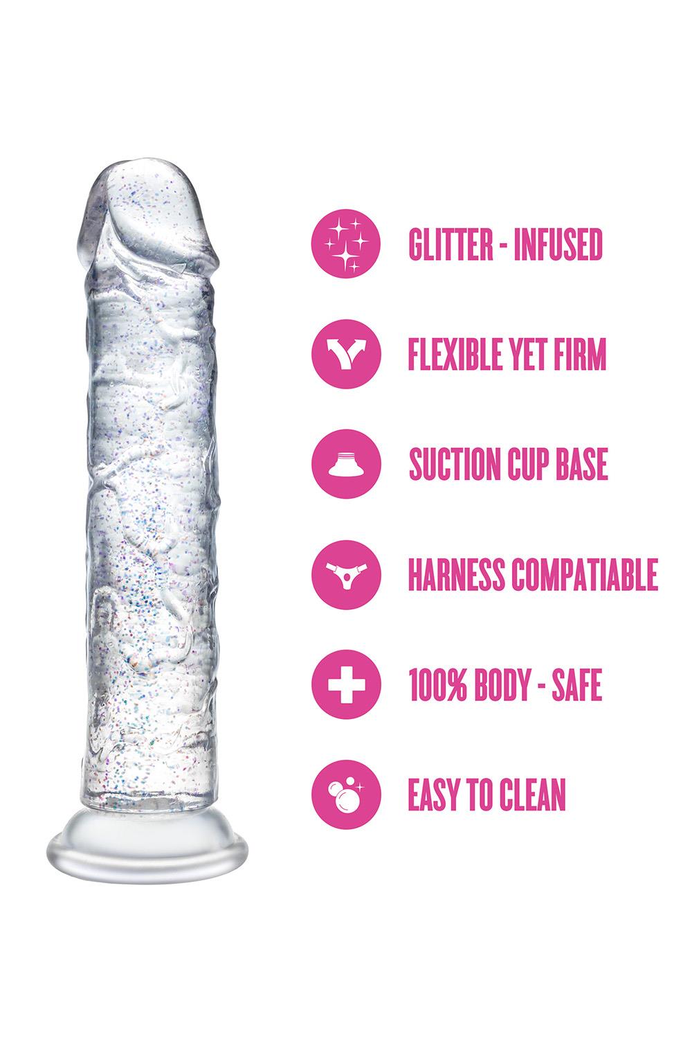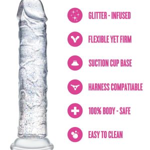 Step into the spotlight with Glamor, the glittering star of your pleasure collection. With its radiant color and subtle sparkle, Glamor adds a touch of glam to every intimate moment. Perfect for those who like their toys with a little extra flair. At 7 inches, it’s a versatile size that’s ideal for both solo exploration and partnered play. Designed to be flexible yet satisfyingly firm, Glamor adapts to your movements while offering a fulfilling experience. The strong suction cup base secures easily to smooth surfaces for hands-free fun and is fully harness compatible, giving you endless options for playful discovery. With its 100% body-safe design, Glamor is easy to clean and always ready for an encore. Whether you’re indulging in a solo performance or sharing the stage with a partner, Glamor ensures every scene ends with a standing ovation.Glitter-infused for vibrant colour and sparkleFlexible yet firm for maximum pleasureSuction cup base and harness compatible100% Body-safe, travel-friendly, easy to cleanLength: 7 inch / 17,8 cmInsertable length: 6.5 inch / 16,5 cmWidth: 1.5 inch / 3,8 cm