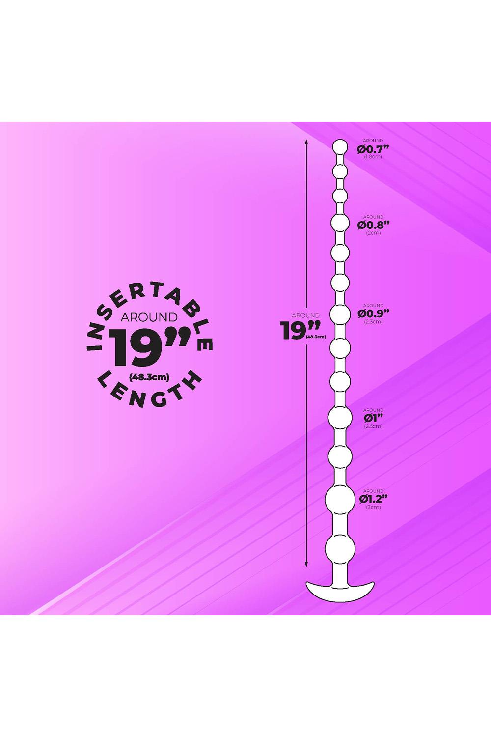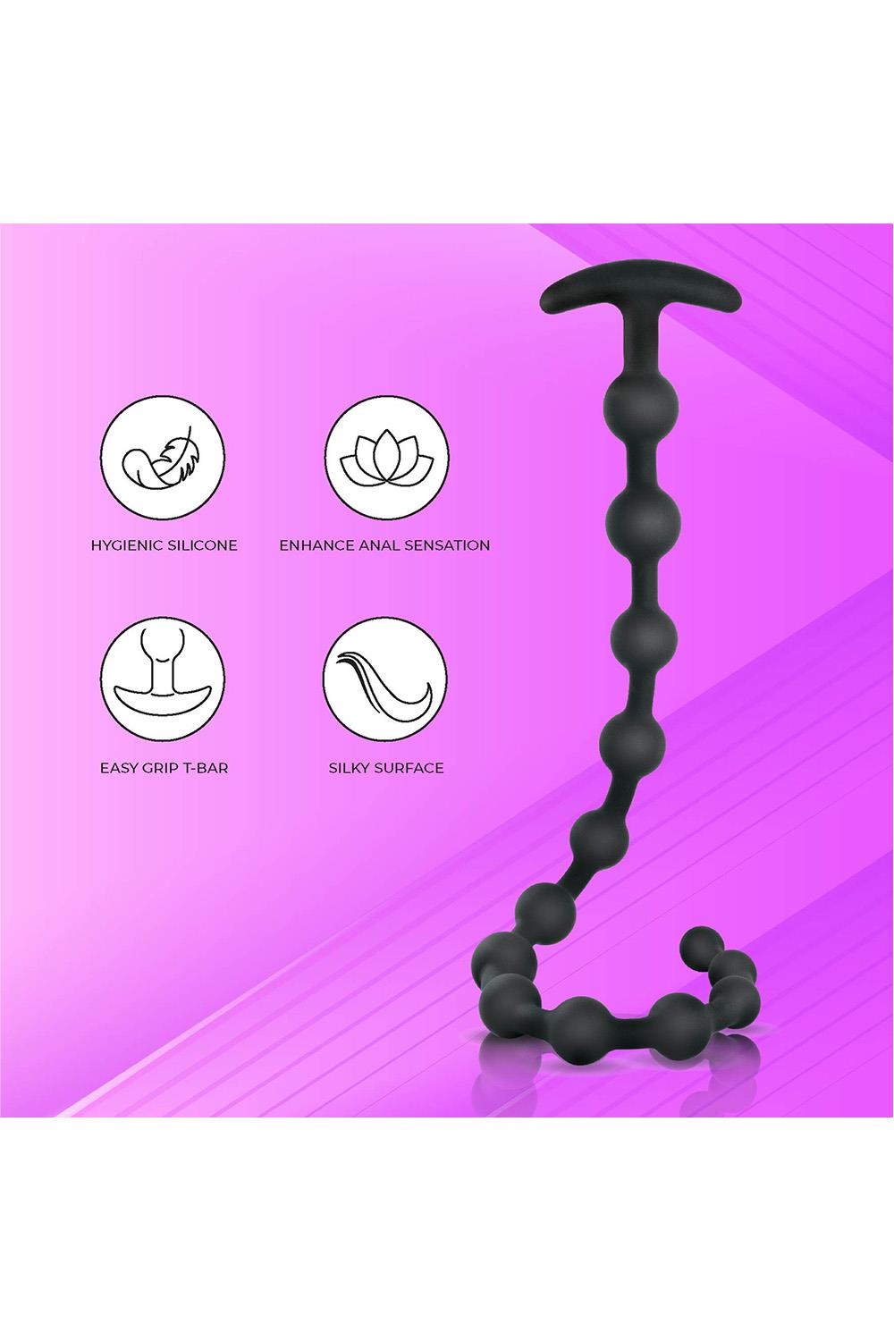 Anal beadsMade of body safe siliconeEasy grip T-barHygienic siliconeEnhance anal sensationSilky surface to the touchGraduated beadsLength 19 inch / 48,2 cm