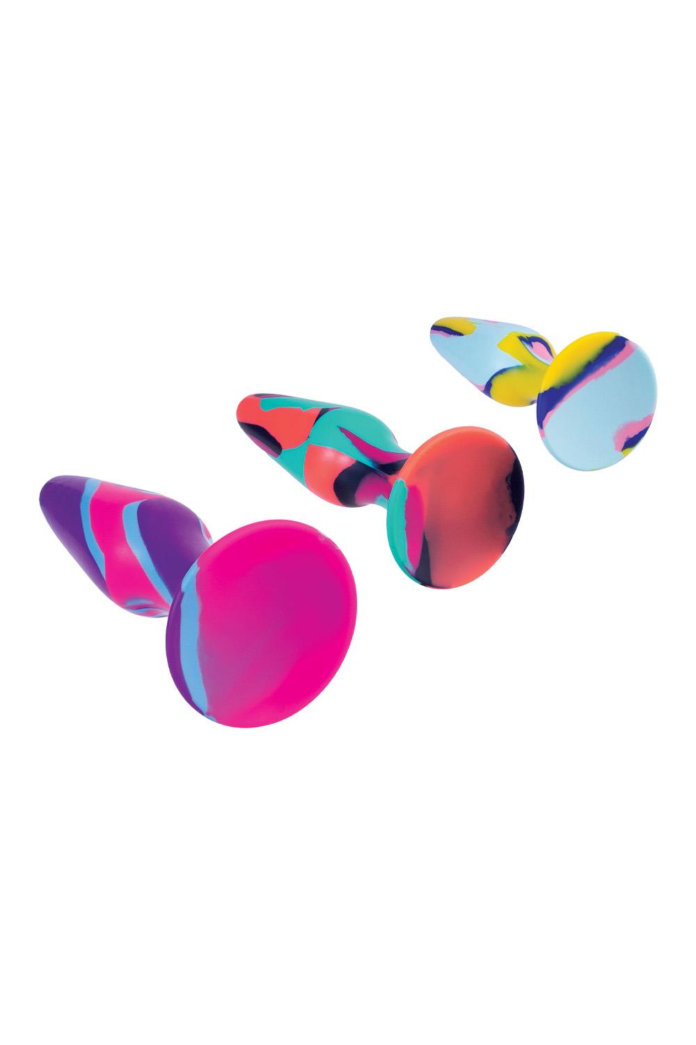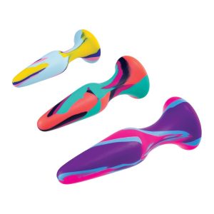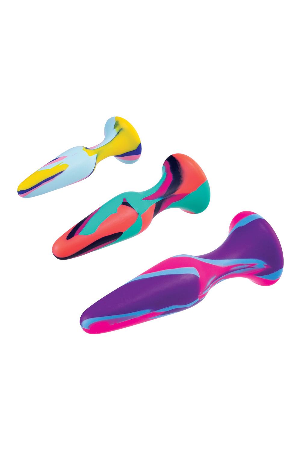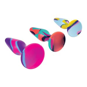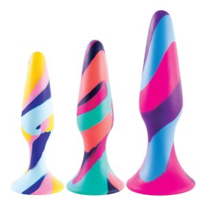Set of 3 Butt PlugsMulti-colouredMade of siliconeNew advanced colour mixing technologyPerfect for beginnersPremium SiliconeErgonomic designSuction cup baseSizes: 4.5 inch, 5 inch, 6 inch / 12,7 cm, 13 cm, 15,2 cm