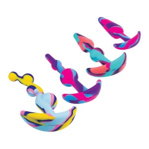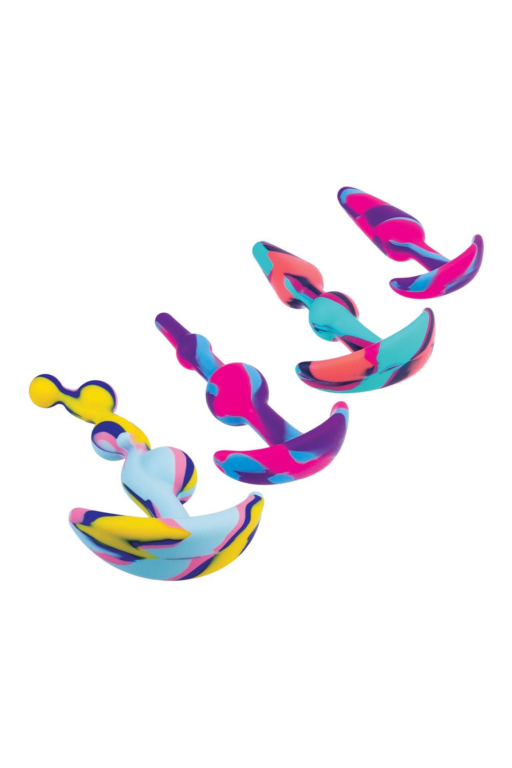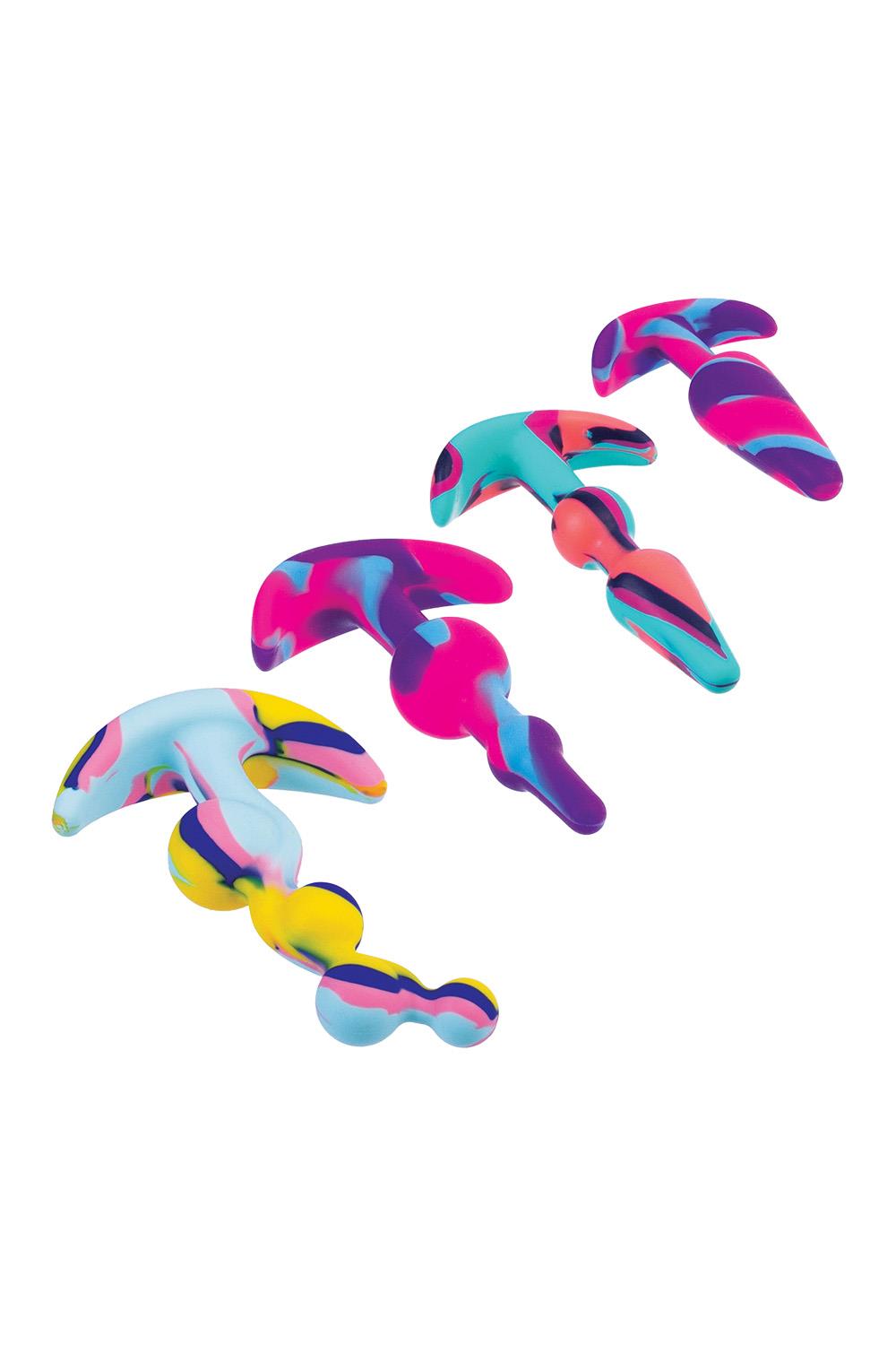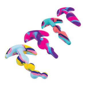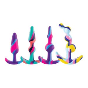 Set of 4 Butt PlugsMulti-colouredMade of siliconeNew advanced colour mixing technologyPerfect for beginnersPremium SiliconeErgonomic designSuction cup baseSizes: 3 inch, 4 inch, 4 inch, 4.5 inch / 7,6 cm, 10,1 cm, 10,1 cm, 11,4 cm