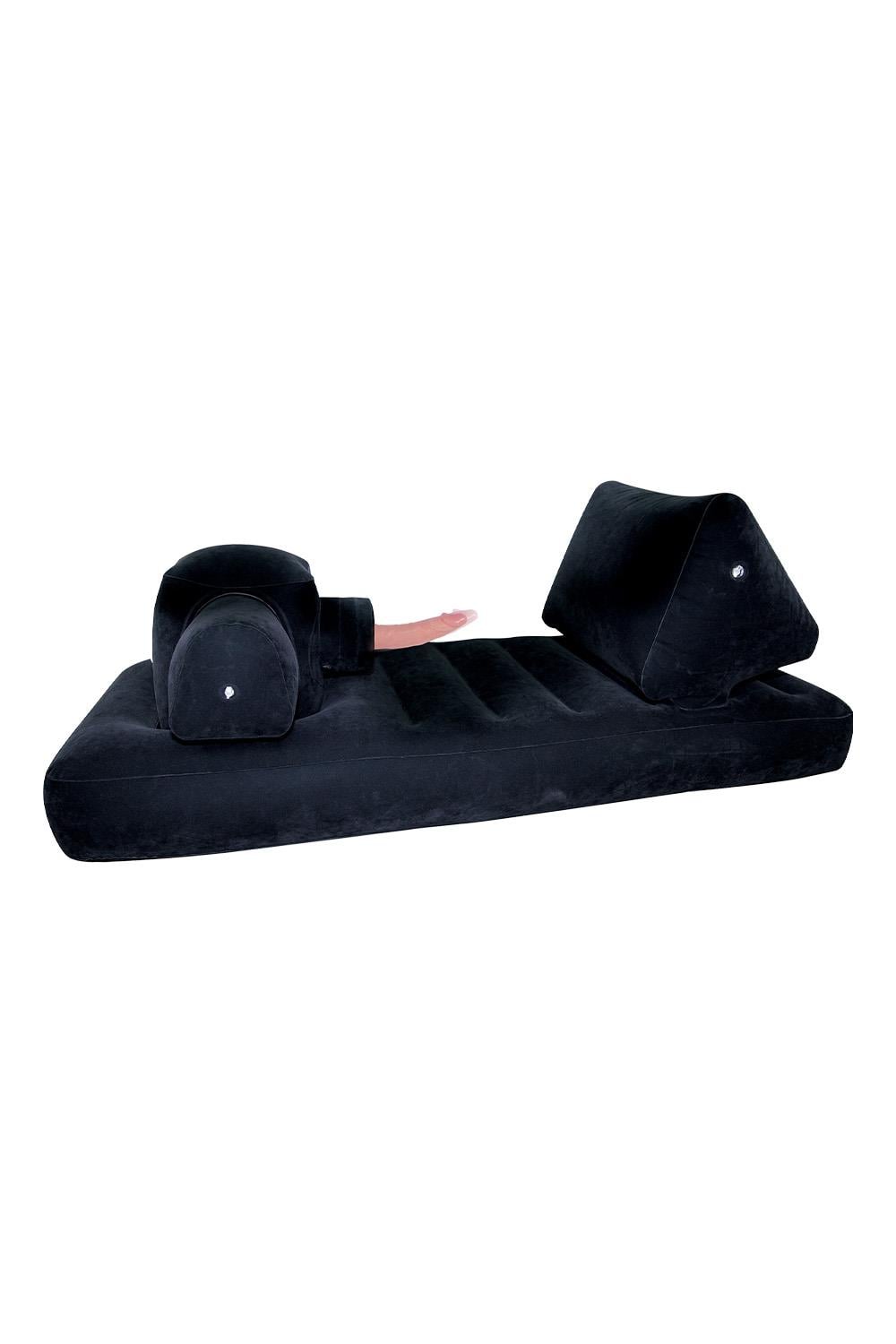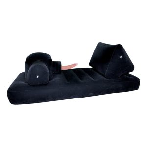 Premium inflatable bed with velvet surfaceWith thrusting machine and wireless controllerVibrator moves in forward and backward motionRemote conroled with 3-speed thumpingErgonomic design for sex positionsRechargeable air pumpIncluded:2 Vibrating silicone dildos, length 7 inch / 17,8 cm and 6.5 inch / 16,5 cm1 Rechargeable air pump1 Rechargeable power pack1 Charging cableDimensions: