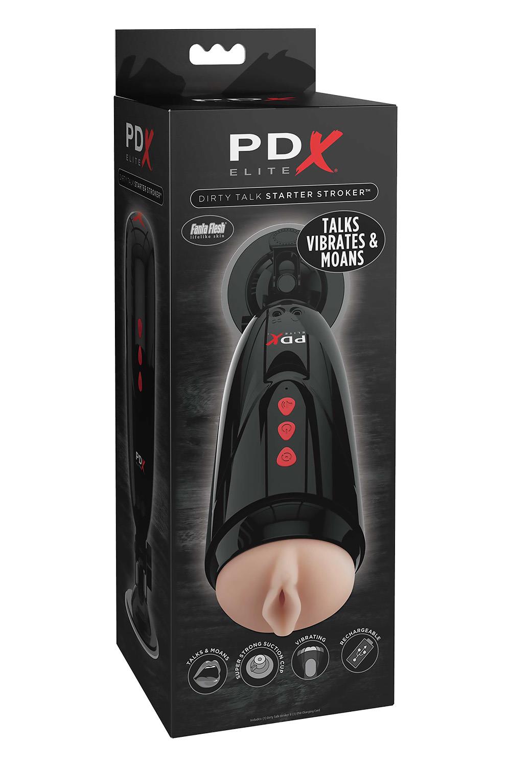 Perfect for beginners, the PDX ELITE® Dirty Talk Starter Stroker offers a total sensory pleasure experience. Powerful vibration is combined with passionate moans and sexy talk to take your masturbation sessions to entirely new levels of satisfaction! A super-smooth, lifelike Fanta Flesh® interior sleeve lined with massaging ribs, bumps and pleasing textures will fulfill your fantasies with every thrust.