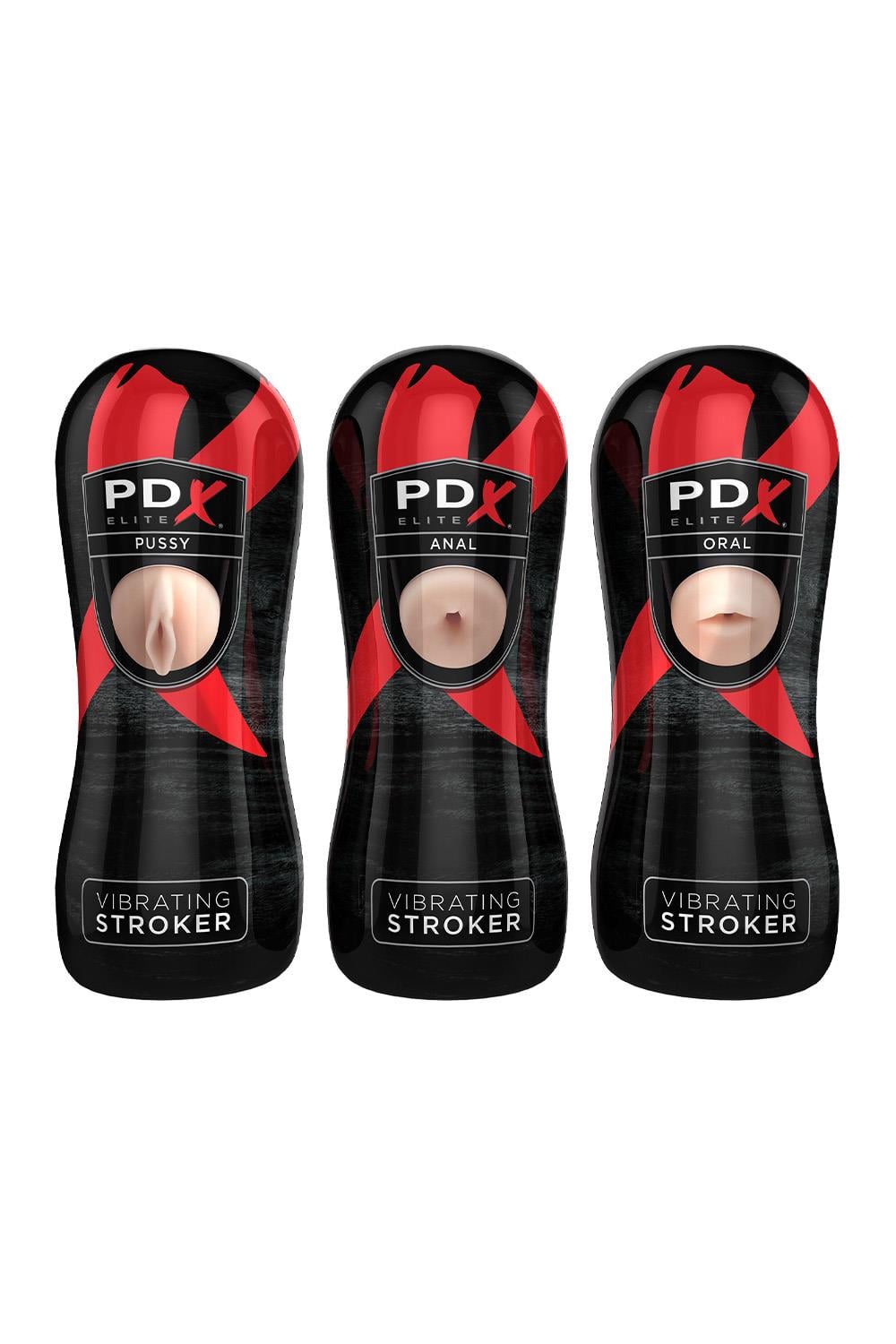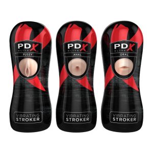 The Vibrating Stroker Display includes the Vibrating Pussy Stroker, Vibrating Anal Stroker and Vibrating Oral Stroker from PDX Elite. The Vibrating Strokers massages the penis with exciting vibrations through a bullet and is made with our realistic Fanta Flesh material. For the ultimate sensation insert the vibrating bullet into the hole on the bottom of the sleeve.