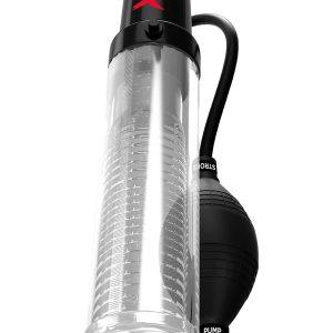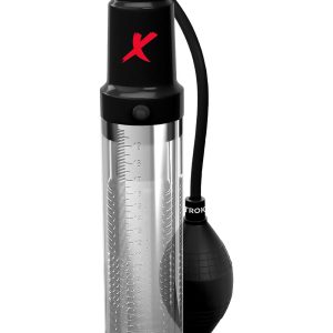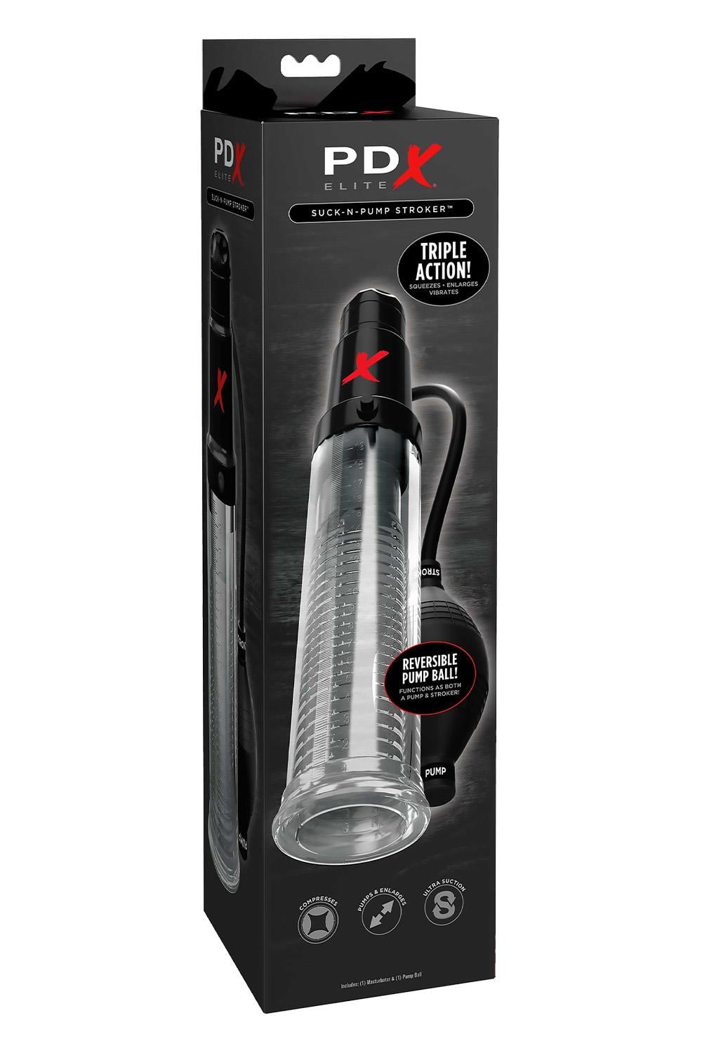 The PDX ELITE® Suck-N-Pump Stroker features a medical-style pump ball that functions as an erection pump in one position and as a masturbation stroker in a second position— double the performance options of an ordinary pump!