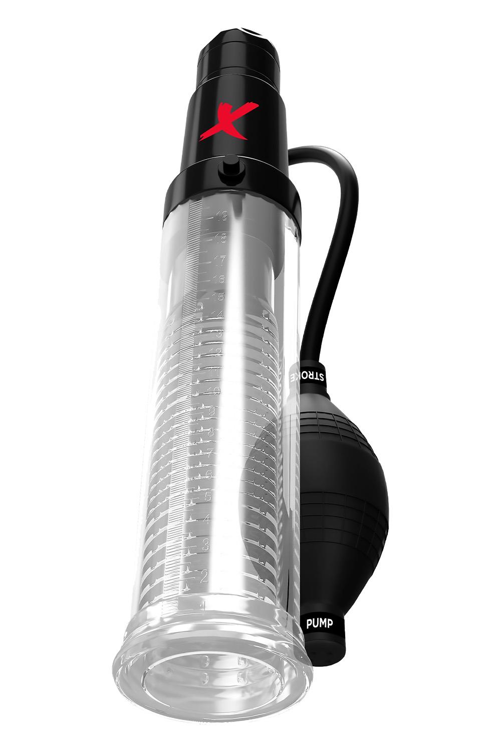 Twist the top dial to activate powerful multi-speed vibrations for additional stimulation. The soft TPR sleeve forms an air-tight seal against your skin, creating incredible suction and amazing results, while the crystal-clear tube is designed for a firm grip and has a convenient ruler to gauge your expansive growth. You can instantly relieve pressure by pressing the air release valve above the pump cylinder.