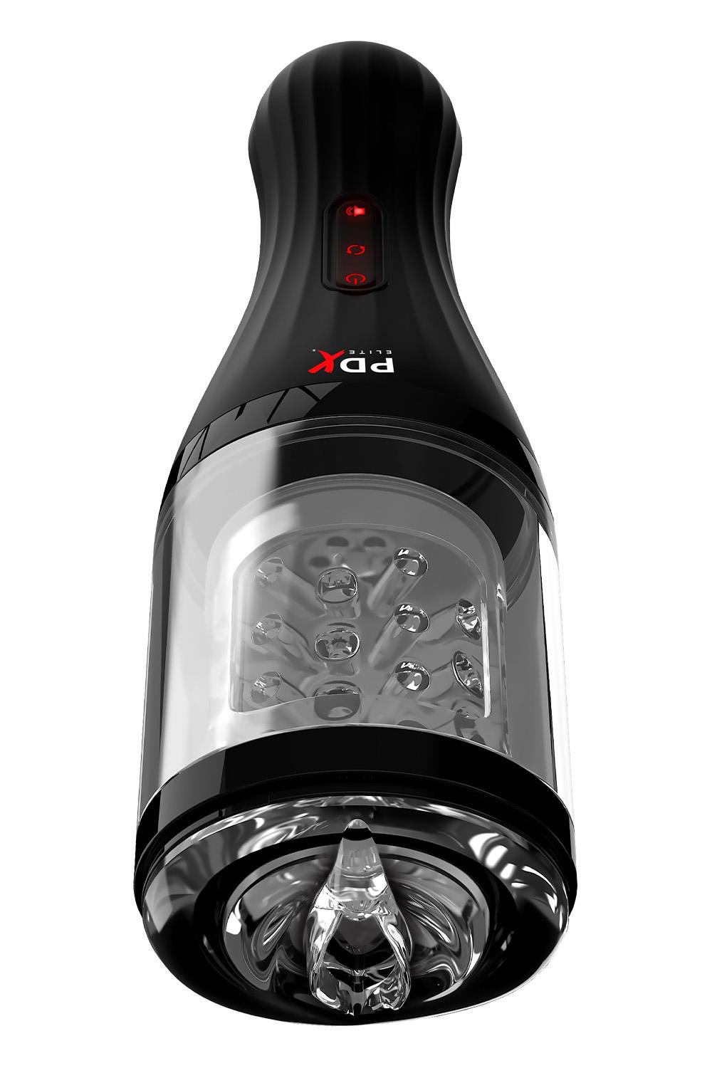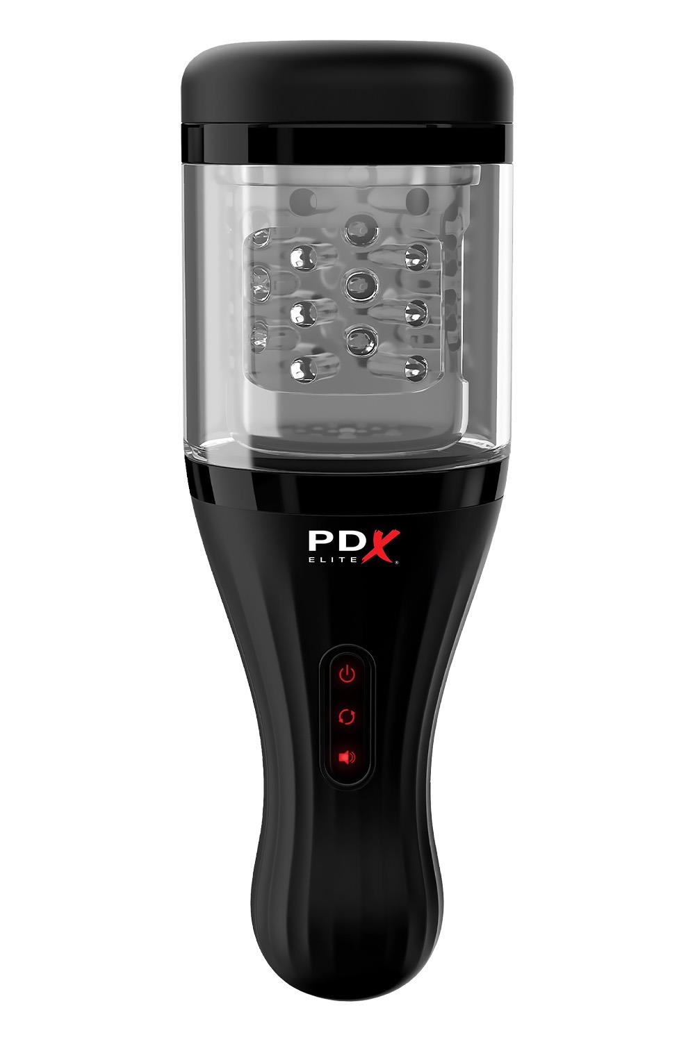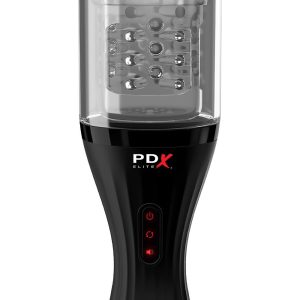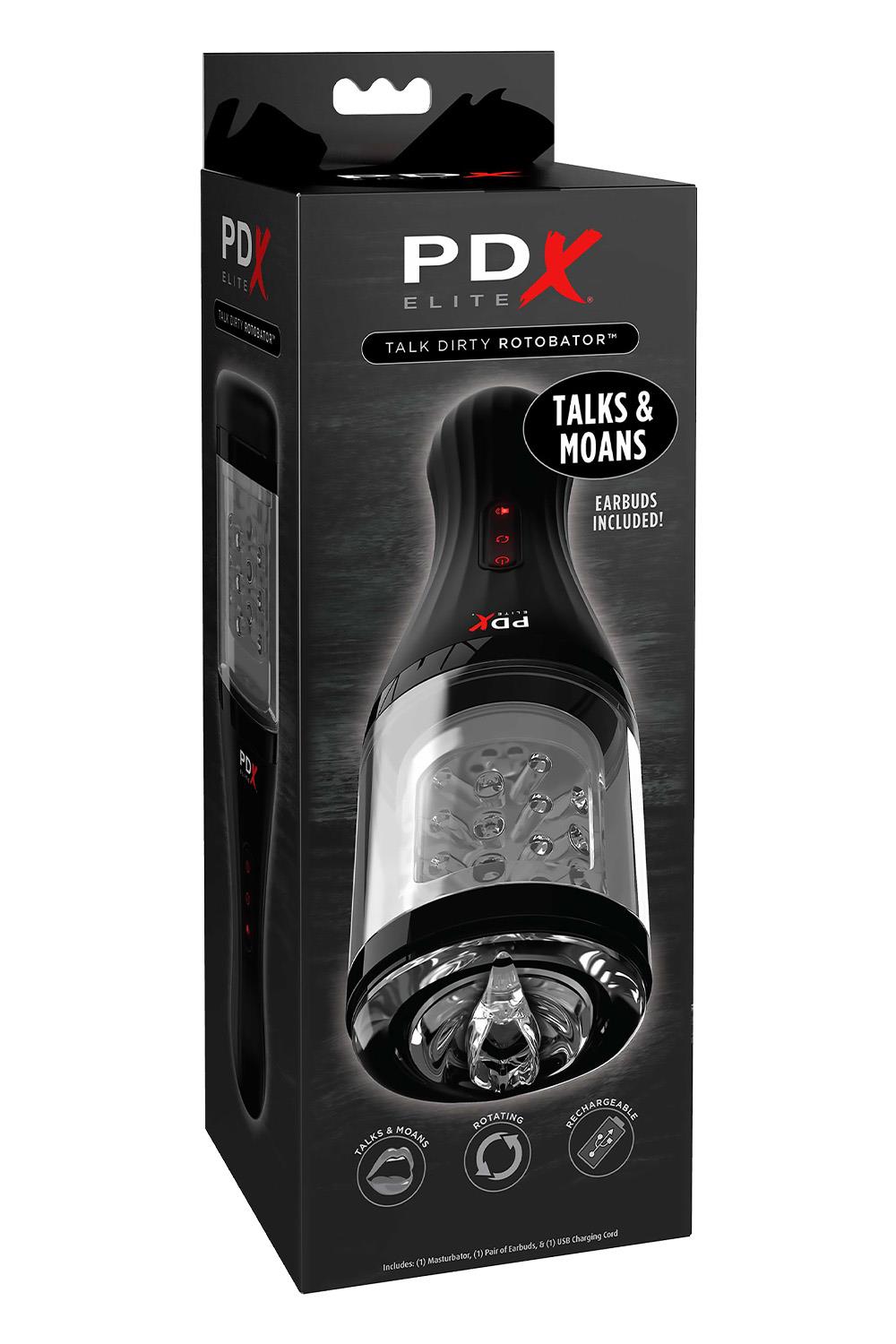 Experience true innovation in masturbation! The PDX ELITE® Talk Dirty Rotobator features sexy talk, breathy moans and uniquely stimulating rotation, all in a compact design. Adding the element of seductive sounds adds intense pleasure to every masturbation session, and the convenient headphone jack allows you to listen privately. The Talk Dirty Rotobator features an advanced rotation mechanism that wraps around the sensitive areas of your upper shaft. The supple opening fits snugly, and with each automated revolution the super-soft TPR sleeve’s tiny ticklers tease, please and spin around with the simple press of a button. The handheld design is perfect for travel and storage.