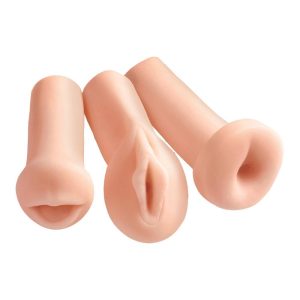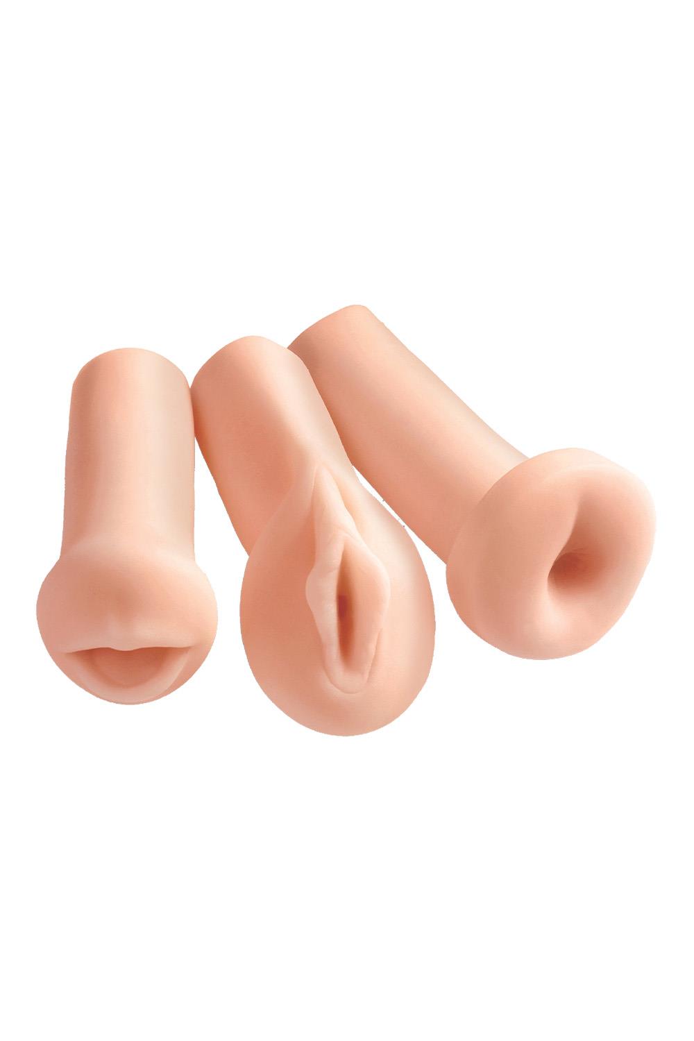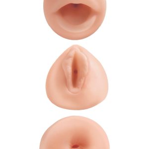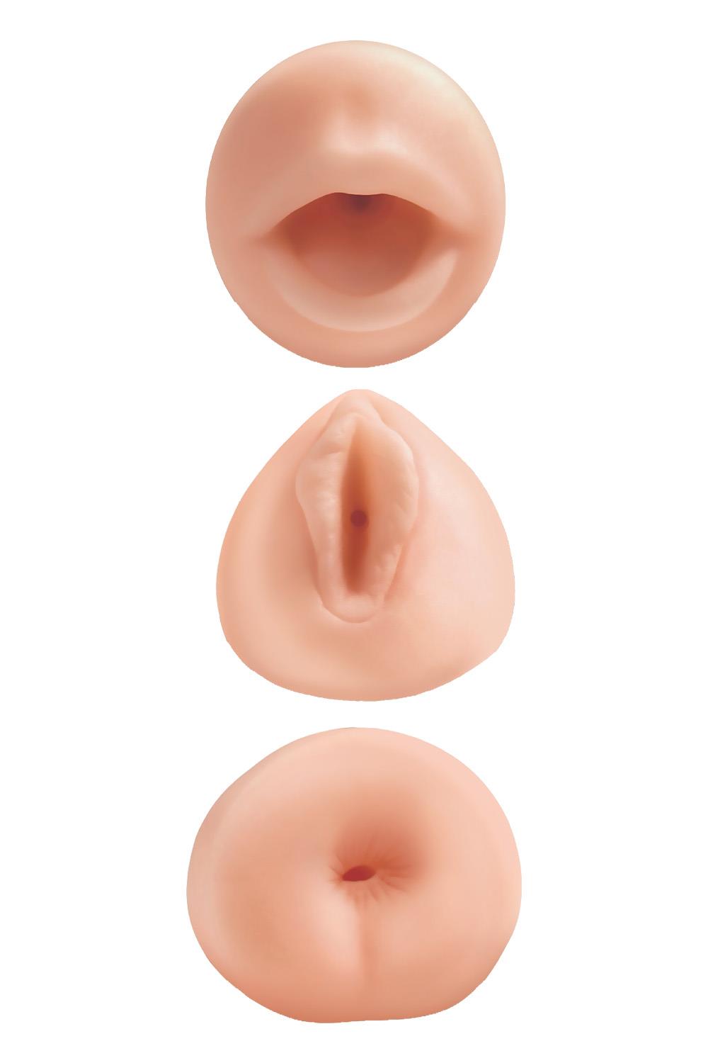 Choose between a wide-open mouth, a spread-eagle pussy, or a virgin-tight ass, or enjoy all three! Slide inside each one of the strokers and you’ll swear they feel just like the real thing…only better!