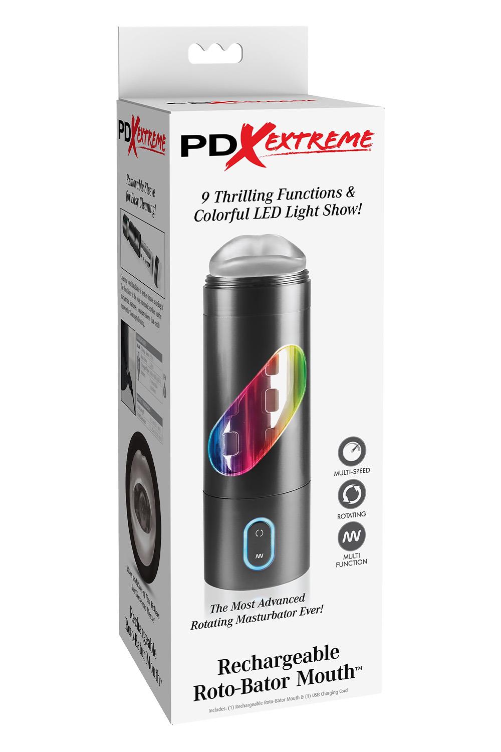 The Rechargeable Roto-Bator is the ultimate turbo powered masturbator that does all of the work for you! No more pumping, stroking, or squeezing just push a button and enjoy mind-blowing stimulation developed to make you cum harder than ever before!Unlike ordinary strokers that barely move up and down, the Roto-Bator 's advanced rotation mechanism puts a whole new spin on male masturbation! With each revolution of the soft TPR sleeve, the tight mouth wraps around the sensitive areas of your cock while the tiny ticklers tease and please, delivering spine-tingling sensations that are better than the real thing! You get mind-blowing satisfaction when you want it, for as long as you want, without any strings attached!Powered by an ultra-strong motor, this full automated masturbator features nine thrilling rotation patterns to choose from. Each pattern has a colorful LED light display that changes color with each movement. The reverse oration button instantly changes direction of the spinning pleasure sleeve, allowing you to experiment with endless pleasure combinations every time you use it. It’s engineered like no other masturbator on the market, with independent controls for function and rotation direction.
