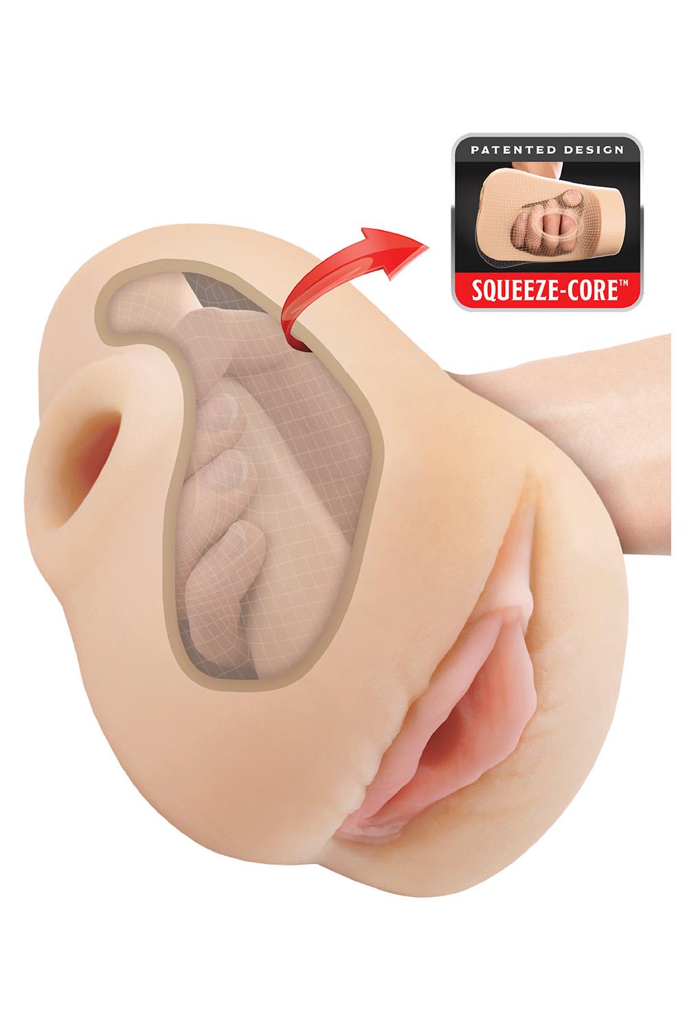 It’s time to go to Pound Town with the hottest stroker collection on the market! Each and every Pounders® stroker features super-realistic details, soft skin-like texture, and our patented Squeeze-Core™ design. While most other strokers are built with a heap of dense material that surround your cock, the patented Pounders® strokers are the first to be built with a hollow cavity that can accommodate your hands, and an interior pleasure tunnel that you can squeeze! This revolutionary design allows you to feel a unique orgasmic sensation that bulky rubber strokers just can’t match. In addition to this, the super-realistic details and Fanta Flesh™ material make this stroker look and feel better than the real thing. Now you can get the perfect grip, your way!SQUEEZE-CORE™ PATENTED DESIGN Our patented Squeeze-Core™ utility design features a hollow cavity built to fityour hands, and an interior pleasure tunnel that you can squeeze! This revolutionary feature allows you to fondle and squeeze your cock like never before!CHOOSE YOUR HOLE Whether you’re craving pussy or ass, you’ll get exactly what you came for!INTRICATE PLEASURE TUNNEL The interior tunnel has been lined with pleasure nubs that were designed to massage every inch of your hard cock.SUPER REALISTIC TEXTURE AND DETAILS The realistic details and skin-like Fanta Flesh® material make this stroker look and feel better than the real thing!RECHARGEABLE BULLET INCLUDED! The remote-controlled bullet fits snugly in your Pounders stroker, delivering mind-blowing vibrations with 10 thrilling modes and adjustable speeds.Includes 1 Squeeze StrokerMaterials: TPECleanup is a snap after the fun with warm water and antibacterial cleaner. Always air-dry before storing. For a smoother experience with this product, use plenty of water-based lubricant.