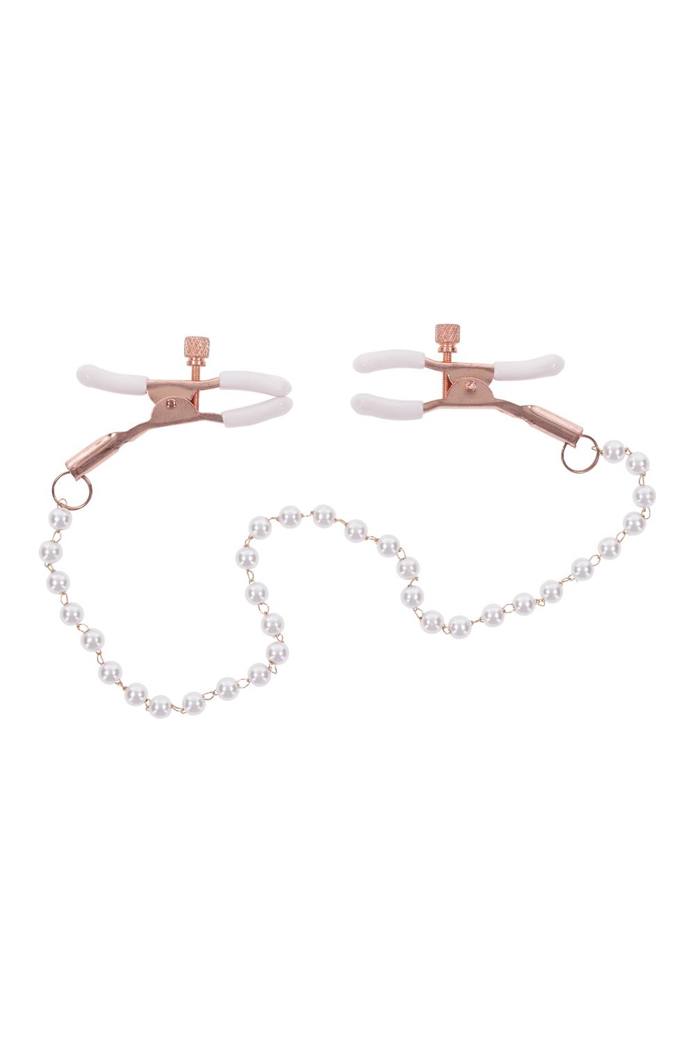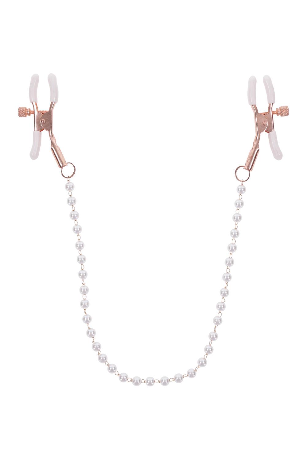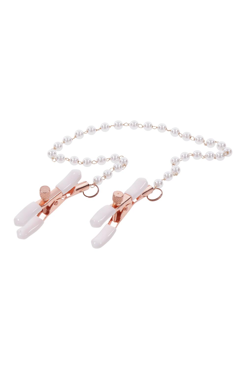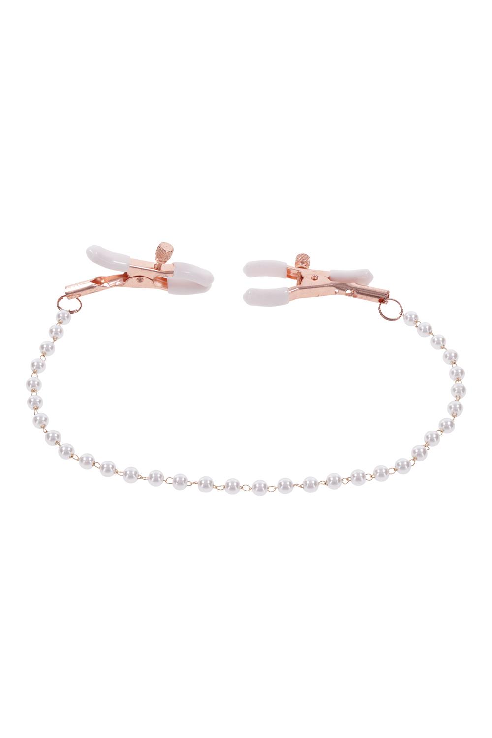 Faux pearl adorned chainNickel-free rose gold chainWhite rubber tipped adjustable nipple clamps increase nipple sensitivityMaterials: 54% Polyurethane, 45% PVC, 1% Steel