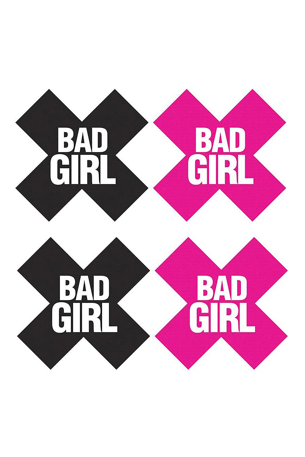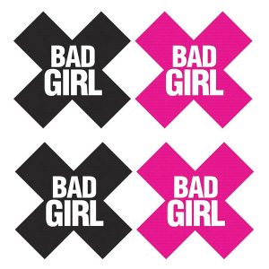 For whatever the occasion, Peekaboos Pasties has the perfect pasty for you. The high-quality, detailed pieces of the Peekaboos Pasties collection provide a vast assortment of styles. With design elements ranging from simplistic ‘X’s and hearts in classic colors, to playfully flirtatious tassels, from jeweled adjustable rings to crystal open designs, Peekaboos Pasties offers a selection of the finest in pasty adornment. Whether you search for something subtle to wear under a sheer top or something outrageous to make an outfit of its own, Peekaboos is sure to provide the perfect option for today’s vivacious woman.Self-adhesive x shaped pasties with Bad Girl written in whiteA hot pink set and a black set Soft and pliableSimple peel the pastie from its backing and apply the sticky side toward the skin