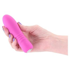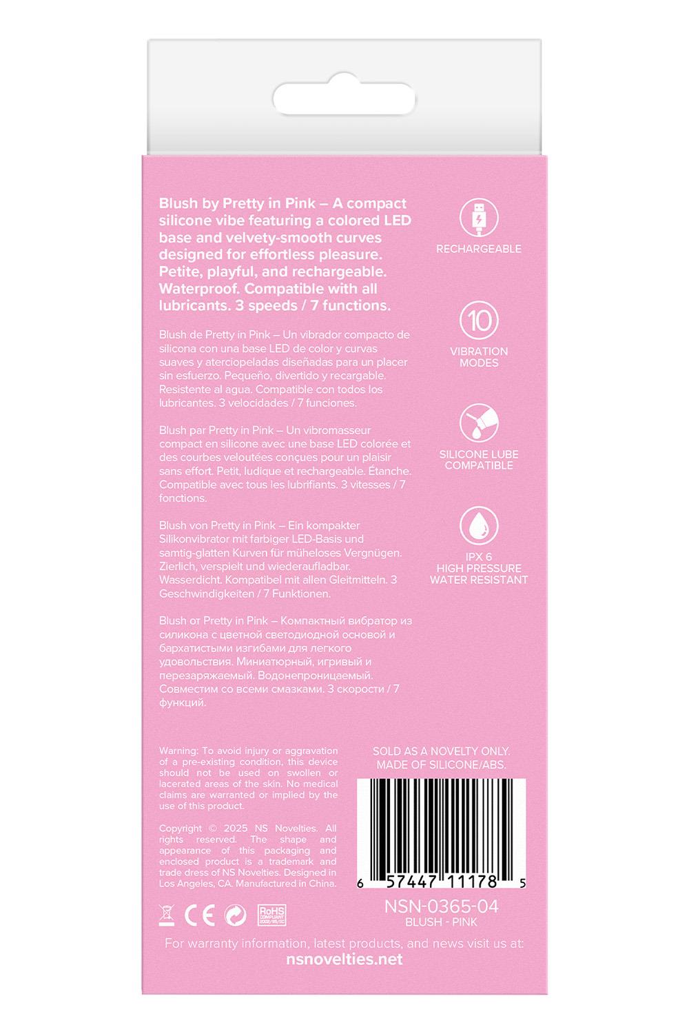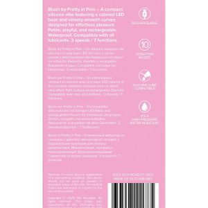 Blush by Pretty in Pink – a compact silicone vibe featuring a coloured LED base and velvety-smooth curves designed for effortless pleasure. Petite, playful and rechargeable. Waterproof. Compatible with all lubricants. 3 speeds / 7 functions. Compact vibratorLED base10 Vibration modesRechargeableIPX 6 waterproofCompatible with all lubesDimensions: 5.12 x 1.34 x 1.34 inch / 13 x 3,4 x 3,4 cmInsertable dimensions: 3.74 x 1.34 inch / 9,5 x 3,4 cmProduct material: SiliconeCharger type: USB-MagnetCharge time: 180 minutesRun time: 50 minutes