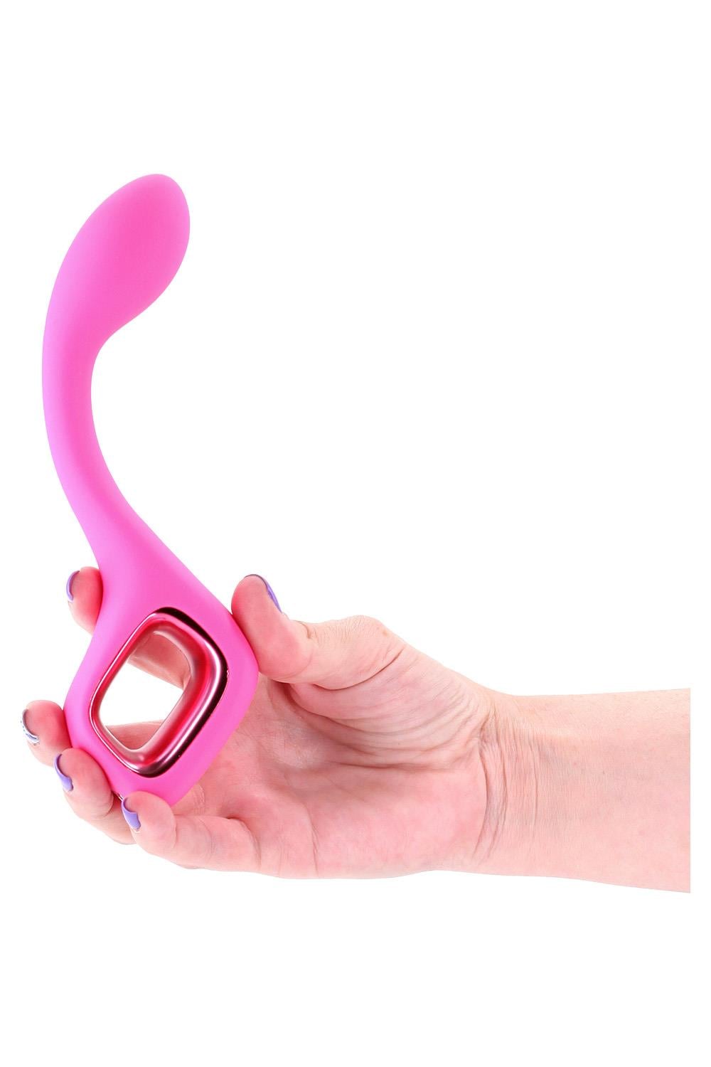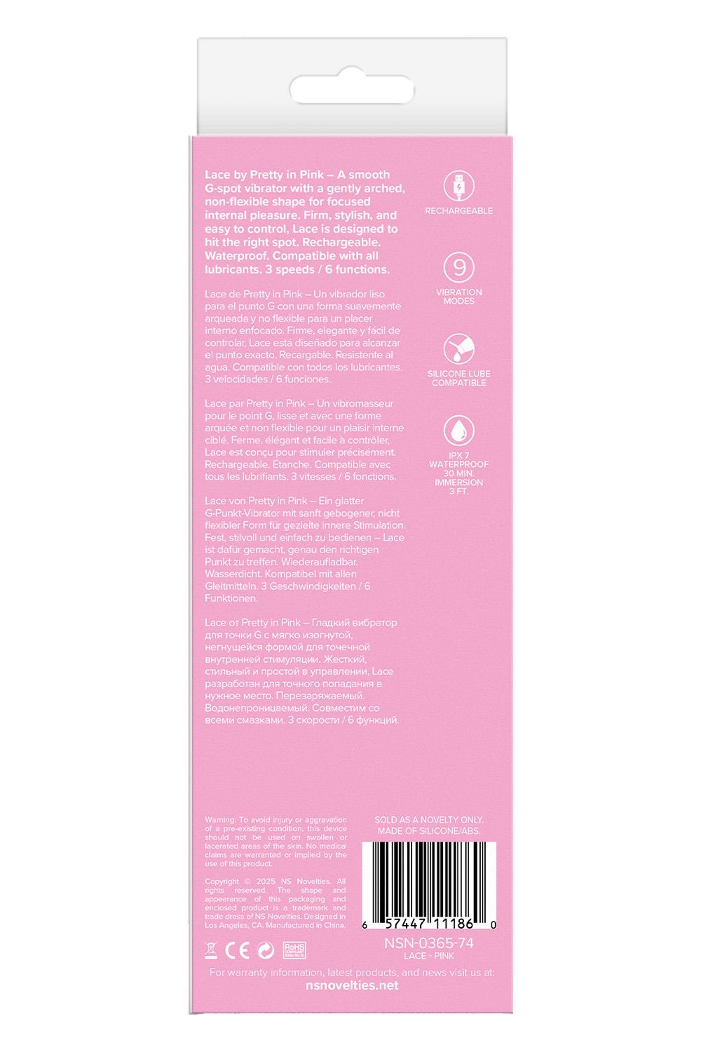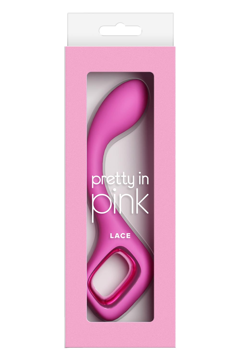 Lace by Pretty in Pink – a smooth G-spot vibrator with a gently arched, non-flexible shape for focused internal pleasure. Firm, stylish, and easy to control, Lace is designed to hit the right spot. Rechargeable. Waterproof. Compatible with all lubricants. 3 speeds / 6 functions.G-spot vibrator9 Vibration modesRechargeableIPX7 waterproofCompatible with all lubricantsProduct Dimensions: 7.36 x 1.3 x 1.97 inch / 18,7 x 3,3 x 5,0 cmInsertable Dimensions: 4.17 x 1.18 inch / 10,6 x 3,0 cmProduct Material: SiliconeCharger type: USB-MagnetCharge time: 120 minutesRun time: 85 minutes
