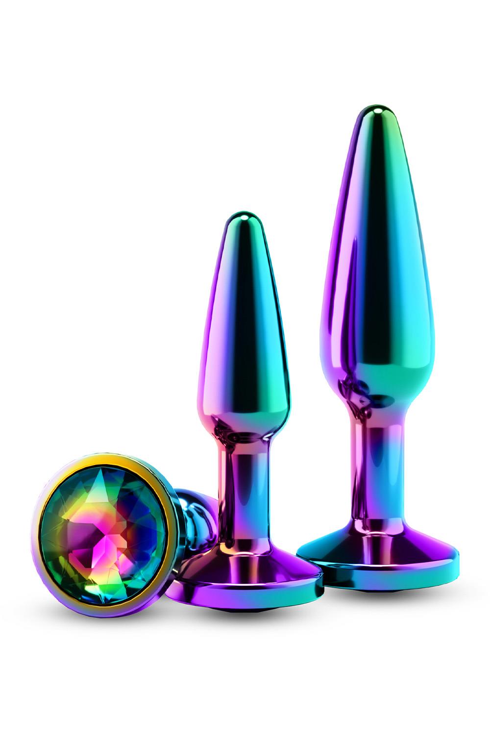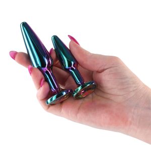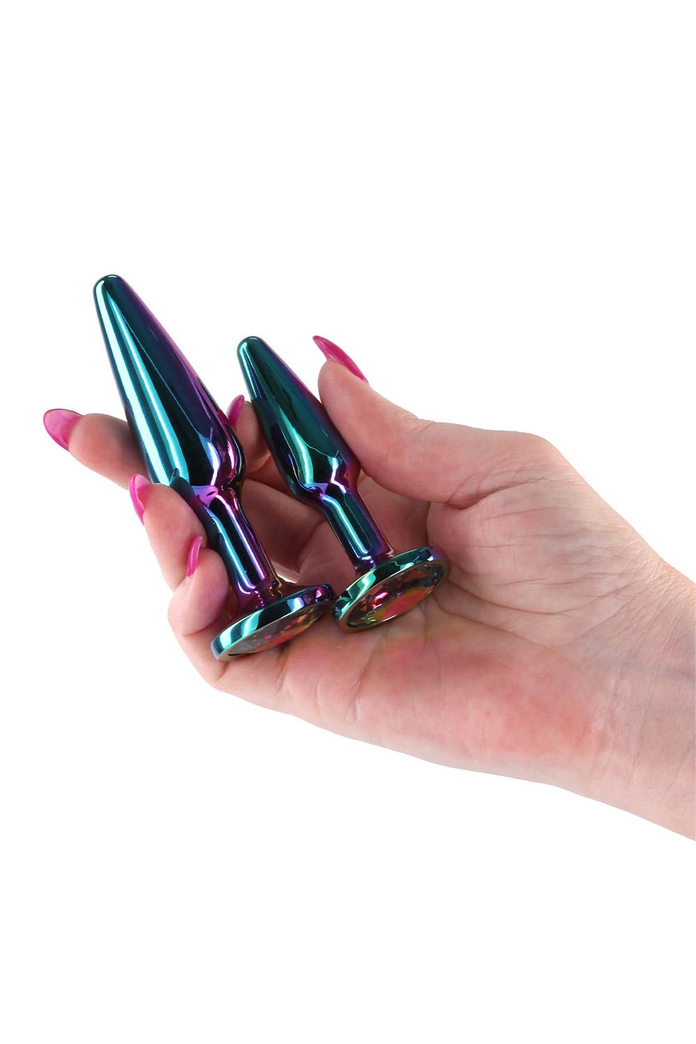 Lightweight, chrome-plated Anal toys designed for visual and sensual excitement. Made of lightweight Aluminum and shaped for effortless penetration, these body safe anal toys are available in a variety of colours, shapes and sizes. Suitable with all lubricants.Kit of 2 plugs, graduated sizesProduct material: AluminumSuitable with all lubricantsSizes:S: 3.07 x 1.26 x 1.26 inch / 7,8 x 3,2 x 3,2 cmM: 3.9 x 1.3 x 1.3 inch / 9,9 x 3,3 x 3,2 cmInsertable dimensions:S: 2.72 x 0.75 inch / 6,9 x 1,9 cmM: 3.43 x 0.94 inch / 8,7 x 2,4 cm