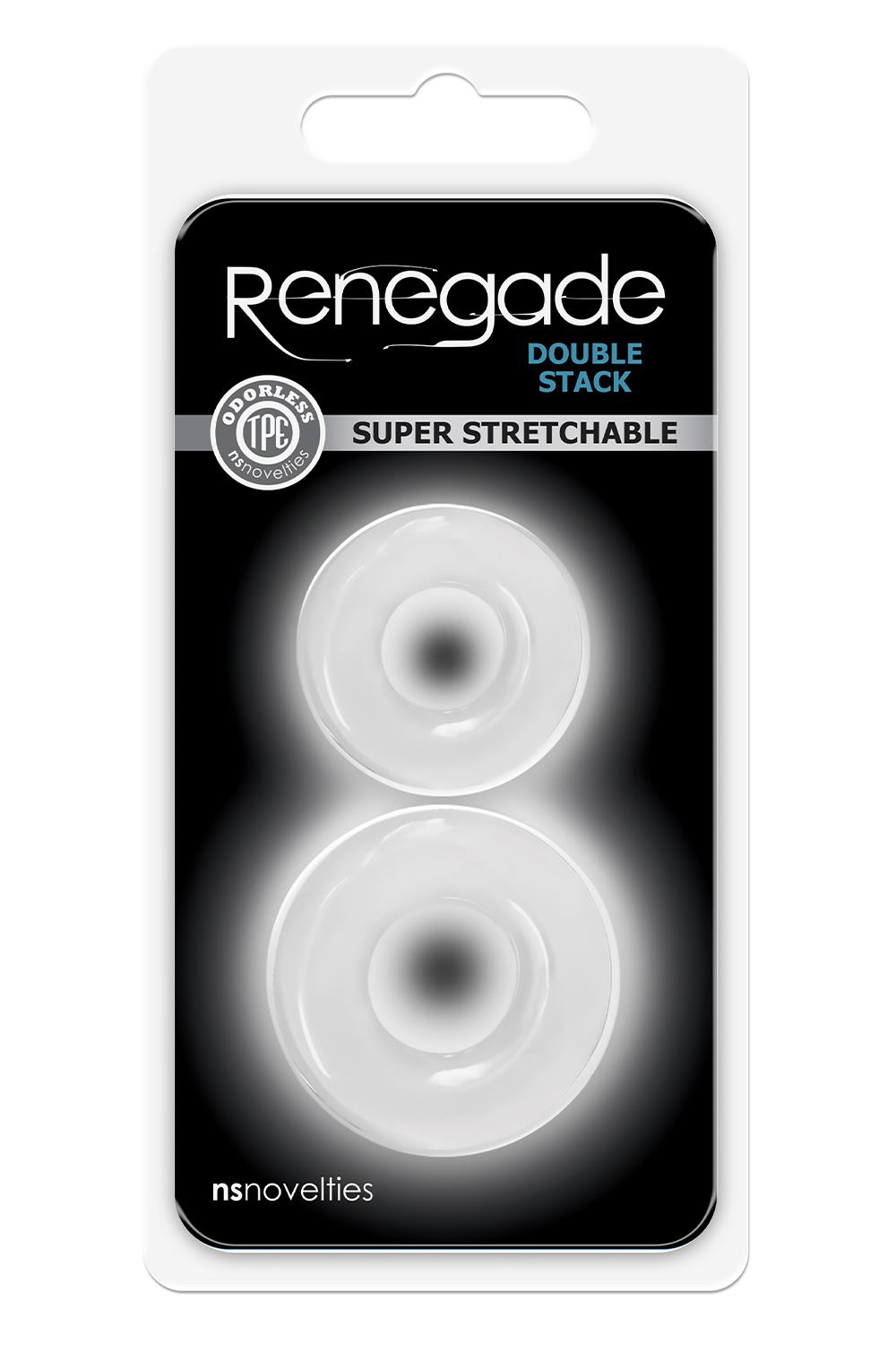 Renegade rings are performance driven, odorless TPE rings that are super stretchy, never sticky and available in assorted colors, shapes and sizes. Try them all for a variety of sensational possibilities and incredible results. Suitable for all lubricants.When you want to keep things going in the bedroom, look to Renegade Double Stack cock rings. Made with an ultra-flexible material that feels silky smooth to the touch, these thick rings are designed to slide on comfortably — and enhance every sensation to the maximum. Once you’ve put a ring on it, you’ll never look back! They keep you ready and at attention for longer stretches, so you can keep going and going until you can’t go anymore. As much for your partner’s pleasure as your own, these rings are vital to a solid toy collection.Round out your toy collection with this duo of snug cock rings that enhance your erection like nothing else. They’ll keep you nice and firm and ready for anything the moment might bring. With just enough pressure for you to feel the difference, these stretchy rings are destined to bring some added excitement to the bedroom.Set of 2 penis ringsMade of TPEPhthatlate free, body safeProduct dimensions Small: 1.65 x 1.65 x 0.51 inch / 4,1 x 4,1 x 1,3 cmProduct dimension Medium: 1.97 x 1.97 x 0.55 inch / 5,0 x 5,0 x 1,4 cm