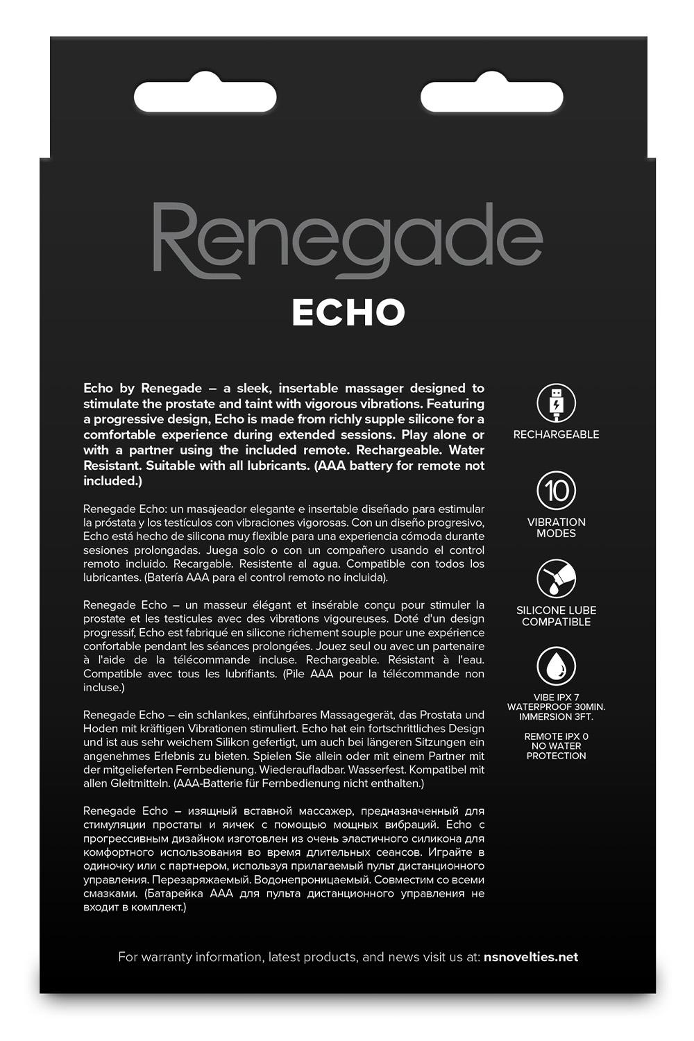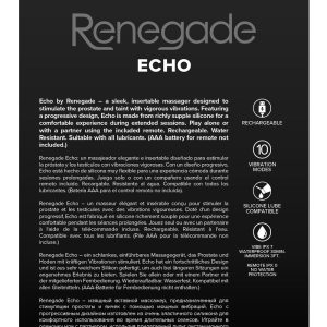 Echo by Renegade – a sleek, insertable massager designed to stimulate the prostate and taint with vigorous vibrations. Featuring a progressive design, Echo is made from richly supple silicone for a comfortable experience during extended sessions. Play alone or with a partner using the included remote. Rechargeable. Water Resistant. Suitable with all lubricants. (AAA battery for remote not included.)Insertable massagerProstate stimulationProduct material: SiliconeRemote controlRechargeable toyRemote uses AAA battery, not includedIPX Rating: IPX7