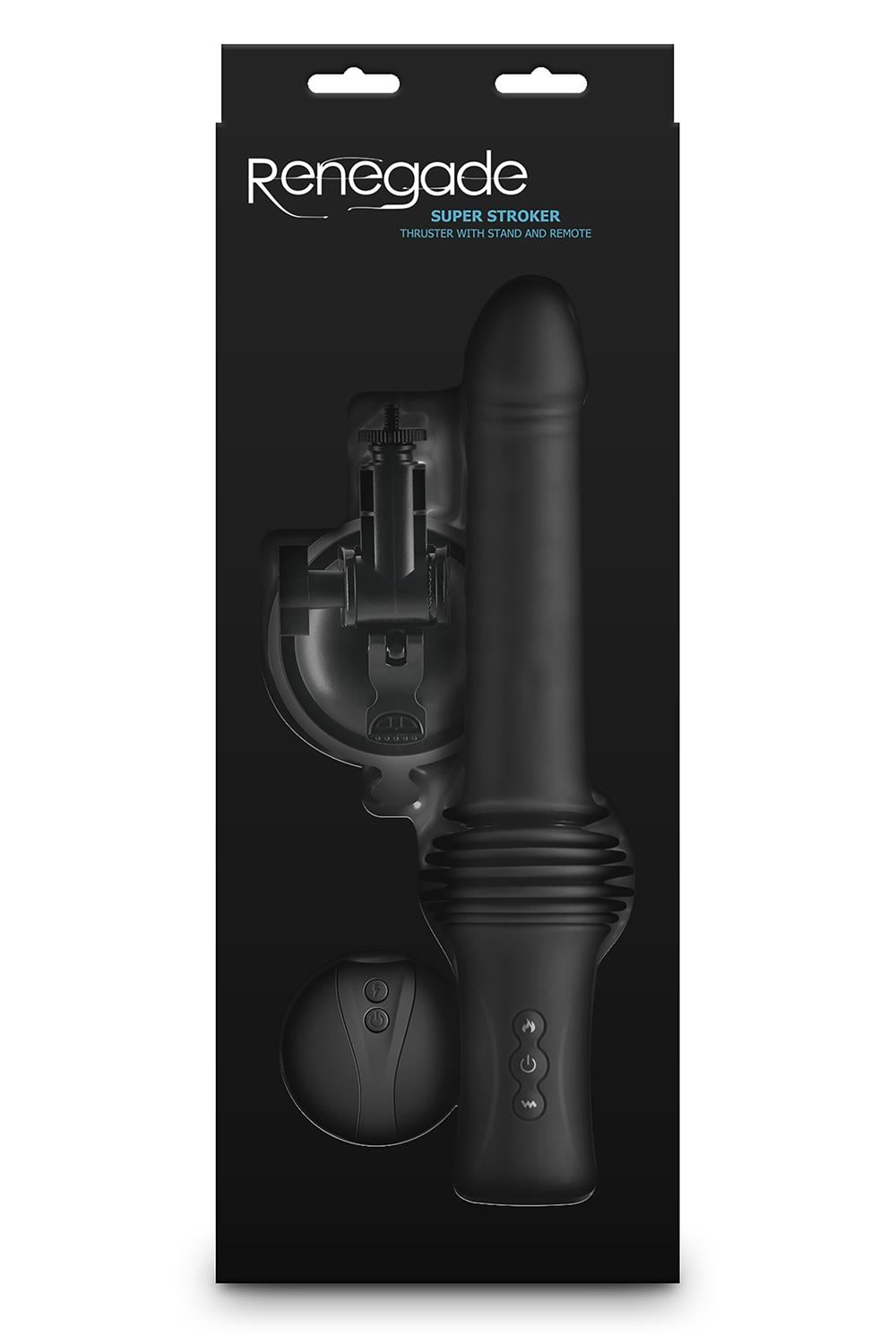 The Super Stroker by Renegade features a 7 inch (17,7 cm) shaft with a long range of motion to produce deep thrusts and robust vibrations for eruptively orgasmic satisfaction. This vibrator includes a screw-in stand with a strong suction cup and a wireless remote for a hands-free setup, as well as a heating function for added sensations. The Super Stroker is rechargeable and suitable with all lubricants. Indulge in euphoric pleasure with the Renegade Super Stroker. Its 7-inch shaft delivers deep thrusts and powerful vibrations, guaranteeing explosive orgasms. This vibrator boasts a screw-in stand with a robust suction cup and a hands-free wireless remote. Experience added sensations with the heating function. Rechargeable and compatible with all lubricants, it offers 3 stroking and vibration speeds, 7 patterns, and a warming feature. Elevate your pleasure with this versatile, innovative toy. (Includes 2 AAA battery for remote.)Deep thrusts, 7 inch shaftRobust vibrationsWireless remote for hands-freeHeating function for sensationsSuitable with all lubricants3 stroker and vibration speeds + 7 vibration patterns + 1 warming functionWith remote control23A Battery for remote includedMade of silicone and ABSPhthalate freeRechargeable with magnetic USB cableCharging time: 150 minutesUse time:: 60 minutesWater resistant: noVibrator: 14.49 x 2.72 x 2.72 inch / 36,8 x 6,9 x 6,9 cmRemote: 2.28 x 2.36 x 0.83 inch / 5,8 x 6 x 2,1 cmStand: 3.62 x 3.23 x 3.23 inch / 9,2 x 8,2 x 8,2 cmInsertable Dimensions: 6.93 x 1.5 inch / 17,6 x 3,8 cm