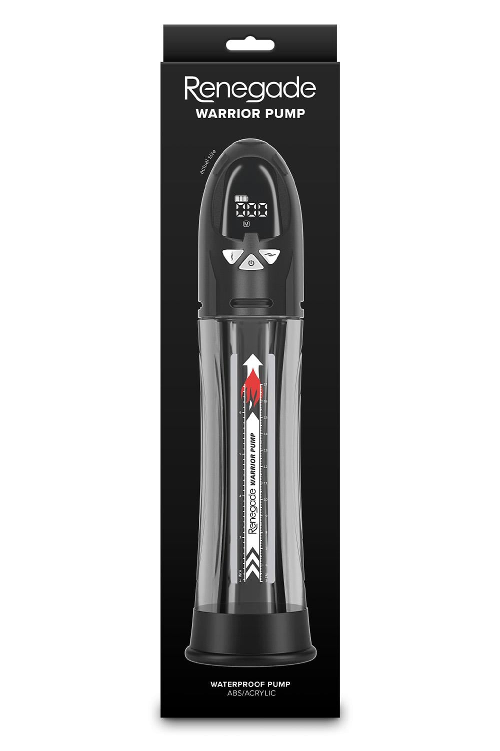 The Renegade Warrior Pump – a revolutionary, waterproof pump that can be used in the tub, shower, pool, and more. Fill up the chamber with water for a wet and wild pumping session. Warrior features an LCD screen to gauge each session, an 8-inch long by 2.75-inch acrylic cylinder, a TPE donut sleeve, and an ABS handle for effortless use. 4 intensity settings / 4 patterns. Rechargeable. Suitable with all lubricants.Waterproof pumpFill with water for wet pumping sessionLCD screenAcrylic cylinder (8 x 2.75 inch / 20,3 x 7 cm)TPE donut sleeveABS handle4 intensity settings / 4 patternsRechargeableSuitable with all lubricantsIPX Rating: IPX8Product dimensions: 12.6 x 3.35 x 3.35 inch / 32 x 8,5 x 8,5 cmCharger type: USB-MagnetCharge time: 120 minutesRun time: 90 minutes