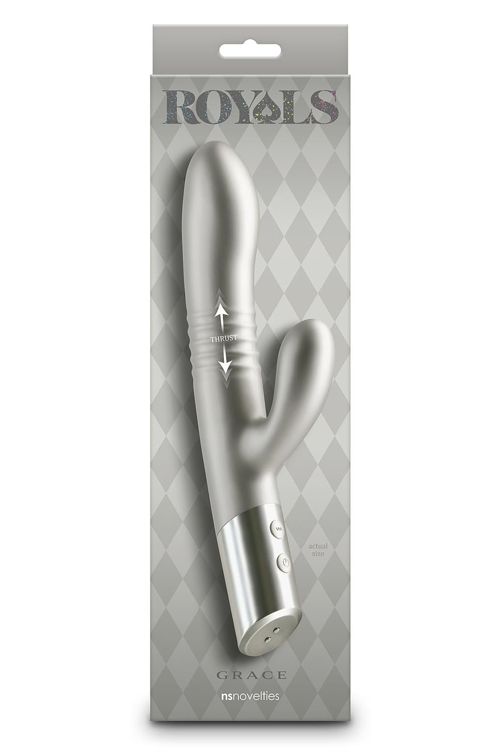 Indulge in royal pleasure with the Royals collection. Grace is an exquisite vibrator, meticulously crafted with a luxurious shimmery plush silicone finish. It boasts multiple speeds and a range of thrilling functions to enhance your intimate moments. Rechargeable and designed for compatibility with all lubricants, Grace offers an elegant blend of style and performance. Perfect for those who seek sophisticated pleasure with a touch of opulence.Duo vibratorExquisite shimmery plush siliconeMultiple speeds and thrilling functionsRechargeable and elegantCompatible with all lubricantsStylish and sophisticated pleasure6 speeds + 14 functionsMade of silicone and ABSPhthalate freeRechargeable with magnetic USB-cableCharging time: 120 minutesUse time:: 90 minutesWater resistant IPX6Height: 24,3 cmWidth: 3,5 cm