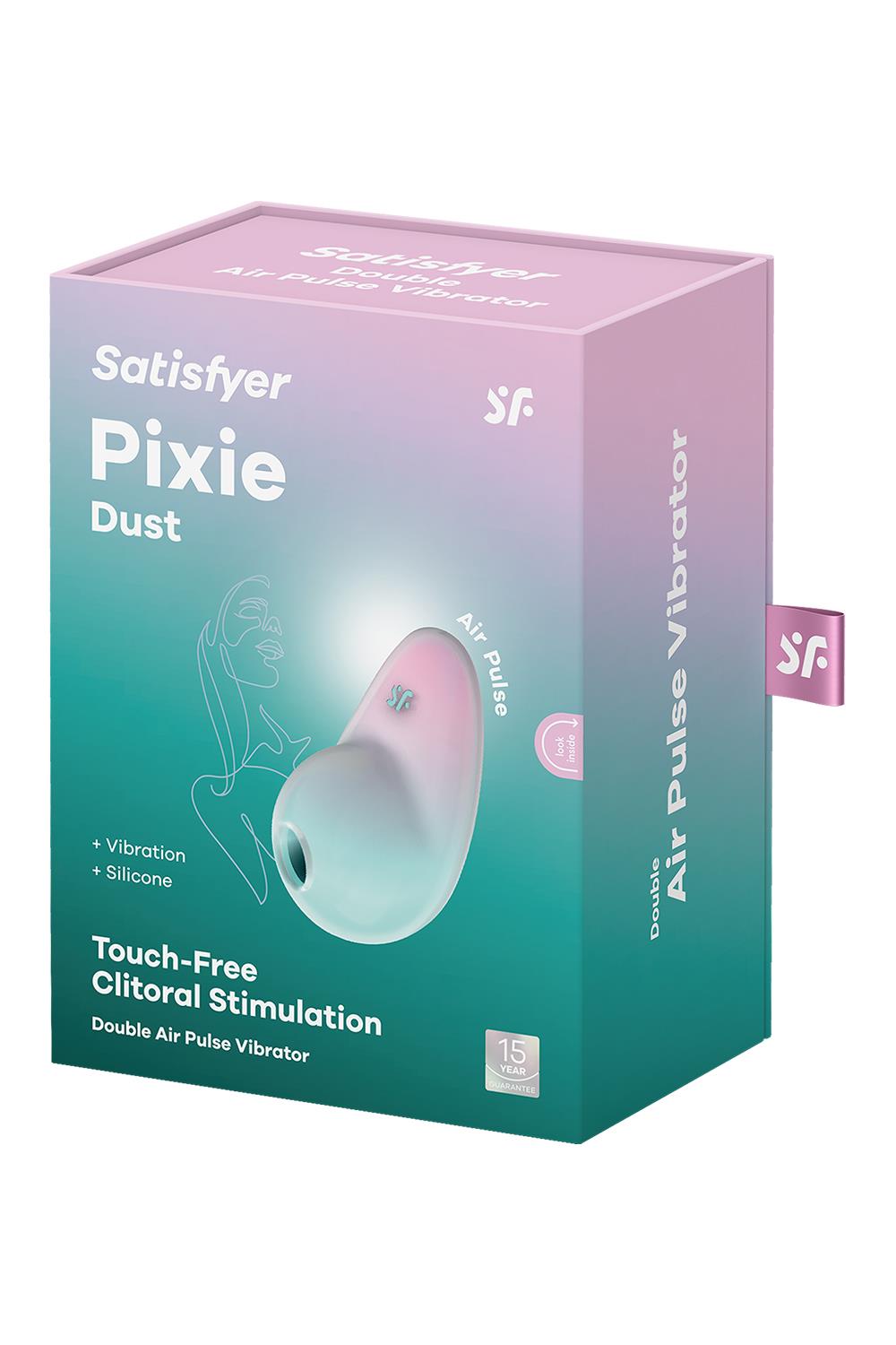 Touchless clitoral stimulation in an enchanting design: meet the Satisfyer Pixie Dust, the latest addition to the range of Satisfyer Double Air Pulse Vibrators. This handy lay-on vibrator stimulates your clitoris with touch-free pressure waves or intense vibrations and fulfills all your sexual wellness wishes. Stimulates the clitoris using intense pressure waves without direct contactMade from super-soft, body-friendly, medical-grade silicone that’s smooth to the touch and extremely hygienicThanks to its waterproof (IPX7) finish, this toy can be used safely in water and is easy to cleanClitoral stimulation through pressure waves and vibrationBody-friendly siliconeWaterproof (IPX7)11 pressure wave intensities + 12 vibration settings2 independently controlled motorsWhisper modeEasy to cleanRechargeable Li-ion batteryMagnetic USB charging cable included Dimensions: 9,39 x 5,33 x 5,9 cmWeight 117,5 gramSatisfyer Pixie Dust: Silicone air pulse vibratorWith the Satisfyer Pixie Dust, you’ll enjoy enchanting clitoral stimulation: Thanks to the innovative, beloved Satisfyer Air Pulse Technology, this lay-on vibrator stimulates your clitoris without direct contact, resulting in exceptional climaxes. Place the opening on your clitoris and experience true magic while choosing from 11 different intense pressure wave programs. But the Satisfyer Pixie Dust has even more magical power, featuring 12 vibration programs, which you can enjoy on their own or combine with pressure wave programs thanks to two individually controllable motors. The surface of the Satisfyer Pixie Dust is made of super soft silicone that is incredibly gentle on your skin. With its charming color gradient and the transparent silicone layer, this love toy also entices you visually.Satisfyer Pixie Dust: Waterproof (IPX7) and rechargeable vibratorThe Satisfyer Pixie Dust can also cast its magic spells under water thanks to its waterproof (IPX7) finish, meaning you can enjoy its company under the shower or in the bathtub. And if it runs out of breath, you can easily give it back its pixie power with the included USB charging cable. With its beautiful design, compact size and intuitive button design, the Satisfyer Pixie Dust is the ideal pleasure toy for beginners and connoisseurs alike – see for yourself and succumb to the charm of this beautiful device!Step into the magical realm of pure pleasure with the Satisfyer Pixie Dust, a pleasure toy here to sprinkle enchantment into your solo time. With touch-free clitoral stimulation and intense vibrations, this delightful pressure wave vibrator invites you to a world of exceptional sensations. Gently place the opening of this enchanting love toy on your clitoris and be transported to a world of wonder, as you explore a spectrum of 11 mesmerizing pressure wave programs that promise to delight your senses. What’s more, the Satisfyer Pixie Dust boasts an extra sprinkle of magic with 12 captivating vibration programs. Let them dance across your senses independently or combine them with the pressure wave programs, thanks to its two individually controllable motors. Crafted with the softest, most delicate silicone, the surface of the Satisfyer Pixie Dust tenderly caresses your skin, creating an experience as enchanting as it looks. Its captivating color gradient and the transparency of the silicone layer will make this lovey captivate your gaze. Thanks to its waterproof (IPX7) finish, you can even take it to the shower of bathtub, letting it radiate its enchanting powers underwater. Embark on an enchanting journey of self-care and prepare to be spellbound by this magical device. Your very own pixie-powered paradise awaits!
