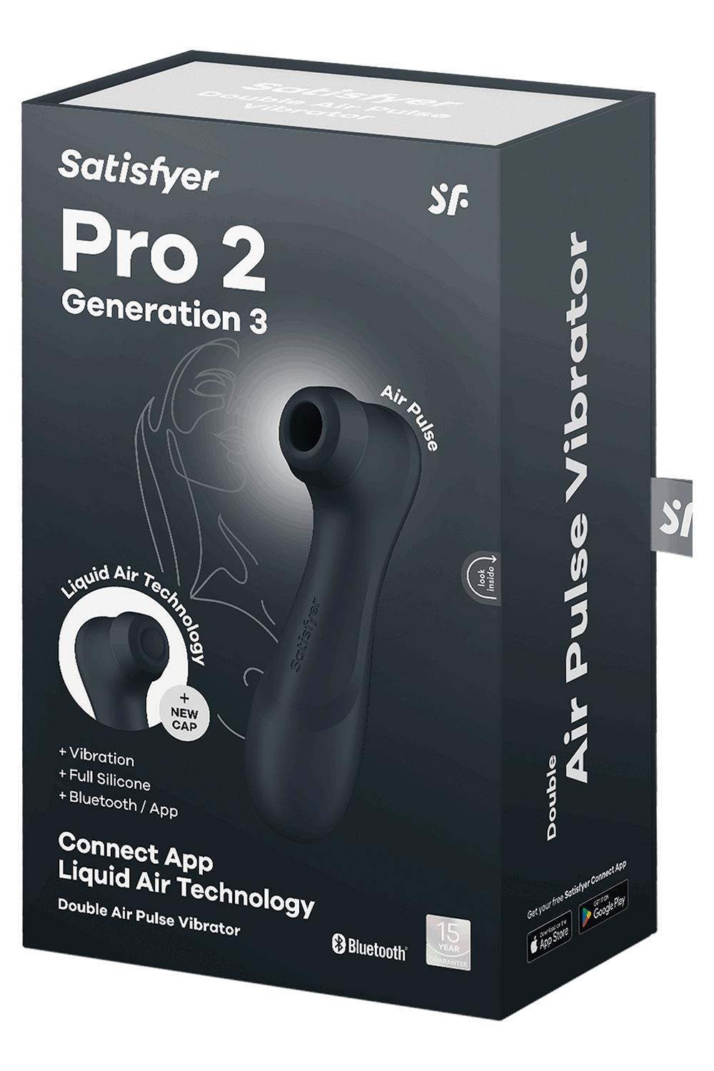 Satisfyer Pro 2 Generation 3 features the sensational NEW liquid air technology. Includes additional new cap with fine membrane to deliver pressure waves with touch, creating a water jet sensation. The body is firm with a soft, full silicone coating; the exchangeable + caps are made entirely of silicone. Liquid Air TechnologyVibrationFull SiliconeBluetooth / AppTwo powerful and independently controlled motors11 Pressure wave intensities, 12 vibration programsApp enabled, which offers an unending range of programsIt has finally arrived: A new wave of pleasure is here with the app enabled Satisfyer Pro 2 Generation 3. Featuring Satisfyer’s innovative Liquid Air Technology, the newest generation of this classic Satisfyer mimics the sensual surge of pulsing water. Liquid Air Technology mimics the sensual surge of pulsing waterStimulates the clitoris using intense pressure waves without direct contactCompatible with the free Satisfyer App – Available on iOS and AndroidWaterproof IPX712 vibration programsWhisper modeBody-friendly siliconeRechargeableMagnetic USB charging cable includedEasy to cleanSatisfyer Pro 2 Generation 3 Connect App: Ride the wave to crystal clear orgasmsThe Satisfyer Pro 2 Generation 3 Connect Appis the ultimate toy when it comes to clitoral stimulation. The successor to the popular Satisfyer Pro 2 is much more than a classic pressure wave vibrator with Air Pulse technology. Thanks to its two motors, you now also have the option of treating yourself to 12 vibration programs. The breathtaking revolution, however, is our innovative Liquid Air Technology: the extra cap with its thin and super-soft silicone membrane creates intense waves that mimic the sensual surge of pulsing water. The Pro 2 Generation 3 floods your body with these pleasure waves, creating a particularly natural feeling and enabling crystal-clear orgasms like you’ve never experienced before. You prefer to tease your clitoris with the familiar and completely non-contact Air Pulse technology? Since the Pro 2 Generation 3 Connect App comes with two attachments, you always have a choice. Immerse yourself in 11 pressure wave programs, which you can use solo or combine with the toy’s vibration modes. Thanks to the Satisfyer Connect app, you’ll enjoy even more variety in your solo sessions: create your own rhythms with the vibration designer, connect your Spotify account and come to the beat of your favorite song, or let your partner control your Satisfyer from anywhere in the world. The app is available for free for iOS and Android.What are other benefits of the Satisfyer Pro 2 Generation 3 Connect App?The Satisfyer Pro 2 Generation 3 Connect App comes in a refined, matte design. Unlike its predecessor, this innovative Satisfyer Air Pulse vibrator is made of 100 % seamless, skin-friendly silicone with Soft Touch Feel, which feels super smooth on your skin and is especially hygienic. Thanks to its waterproof (IPX7) finish, it’s not only the ideal companion for a hot bath or a relaxing shower, but it’s also easy to clean with warm water and mild soap. After you’ve reached mind-blowing climaxes, you can easily recharge the vibrator’s integrated batteries with the included USB charging cable.