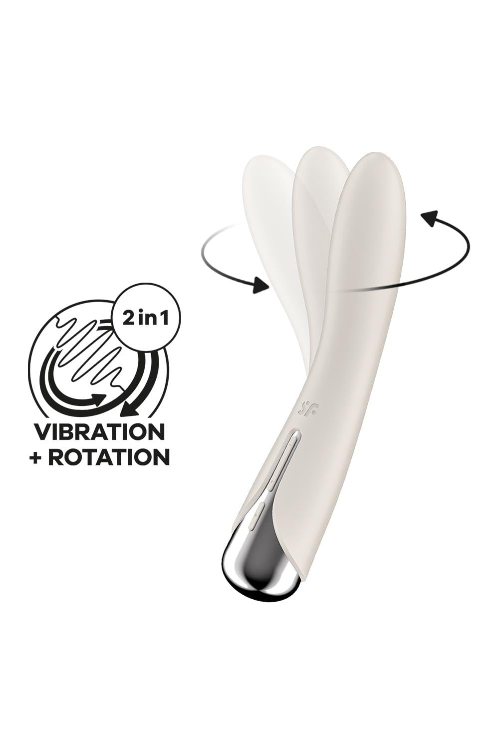 Your pleasure will turn its head right round! The Satisfyer Spinning Vibe 1 is a G-spot vibrator that takes you for a spin with its exciting rotating head and intense vibrations. G-spot stimulation through rotation and vibration. Ideally designed to hit the G-spot for intense stimulation. Thanks to its waterproof IPX7 finish, this toy can be used safely in water and is easy to clean. Body-friendly siliconeWaterproof IPX712 vibration programs5 rotation settingsWhisper modeEasy to cleanRechargeable Li-ion batteryMagnetic USB charging cable includedAuthentic stimulation with the Satisfyer Spinning Vibe 1For those of you who can’t get enough of their G-spot or are just discovering it: the rotating G-spot vibrator called Spinning Vibe 1 provides an especially exciting kind of stimulation. We all know: The G-spot, it’s not just a spot – it’s more like a zone. This vibrator expertly massages it with its rotating head: the Satisfyer Spinning Vibe 1 features 5 rotation speeds (clockwise as well as counterclockwise) and only you decide whether you like it slow or fast. This kind of stimulation feels very natural – an intensely beautiful experience! Enhance this feeling by switching on the vibration: 12 vibration programs, from gentle to ultra-strong, bring your G-spot – or should we say, your G-zone – to dizzying highs. Have fun finding your favorite setting: Rotation and vibration can be controlled separately.Satisfyer Spinning Vibe 1: You spin me right round, babyThe slightly curved shaft of the Satisfyer Spinning Vibe 1 with its rounded tip and the ergonomic design ensure that you hit exactly the right spots (or zones) and that you can insert the vibrator comfortably. It is also made of medical-grade silicone, which not only feels smooth on the skin, but is also absolutely body-friendly. Attention, whirlpools: Take the waterproof (IPX7) Spinning Vibe 1 with you into the bathtub (or under the shower) and enjoy pleasurable moments there as well. Clean the G-spot vibrator with a little soap and water or toy cleaner and recharge it via USB cable. The Satisfyer Spinning Vibe 1 will treat you and your G-spot to intense vibrations and rotating movements – are you ready to feel the spin?