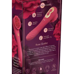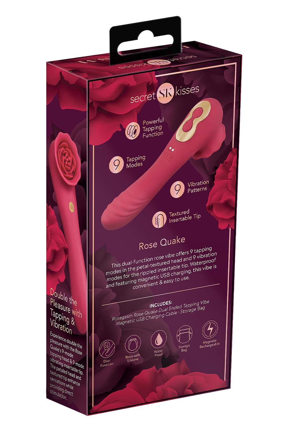 Experience the Rosegasm Rose Quake Dual Ended Tapping Vibe, gentle yet powerfully stimulating sensations. This dual-function rose vibe offers 9 tapping modes in the petal-textured head and 9 vibration modes for the ripple insertable tip. Waterproof and featuring magnetic USB charging, this vibe is convenient & easy to use.9 tapping modes9 vibration patternsTextured inseratble tipPowerful dual functionSplashproofMade from bodysafe siliconeMagnetic USB RechargeableHeight: 7.41 inch / 18,8 cmWidth: 2.15 inch / 5,5 cmWeight: 0.36 lbs. / 163 grMaterials: SiliconeLithium Ion BatteryIncluded:VibeStorage BagMagnetic USB Charging CableInstruction Manual