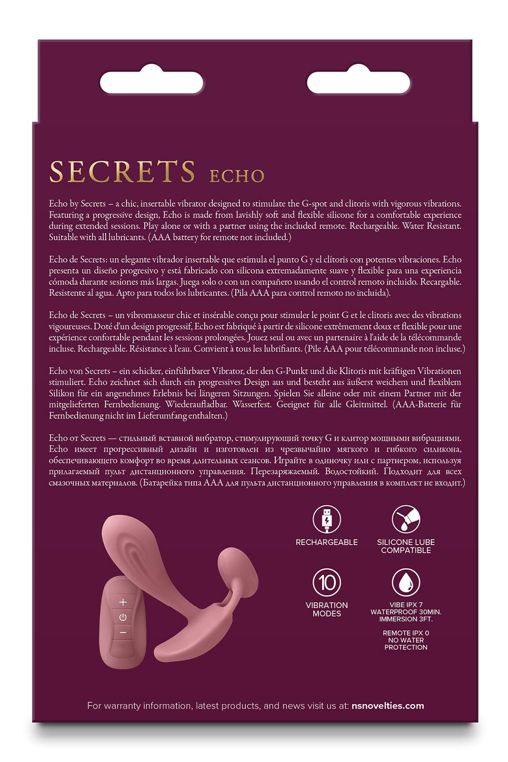 Echo by Secrets – a chic, insertable vibrator designed to stimulate the G-spot and clitoris with vigorous vibrations. Featuring a progressive design, Echo is made from lavishly soft and flexible silicone for a comfortable experience during extended sessions. Play alone or with a partner using the included remote. Rechargeable. Water Resistant. Suitable with all lubricants. AAA battery for remote not included.Echo by Secrets is a chic, insertable vibrator designed to deliver intense G-spot and clitoral stimulation. Its progressive design features lavishly soft, flexible silicone that ensures a comfortable experience during extended sessions. With vigorous vibrations and the convenience of a remote control for solo or partner play, Echo offers versatile pleasure. Rechargeable and water-resistant, this stylish vibe is compatible with all lubricants. (AAA battery for remote not included.)Chic insertable vibratorIntense G-spot and clitoral stimulationSoft, flexible siliconeRemote control for versatile useRechargeable and water-resistantPlay alone or with a partnerIncluding remote control (AAA battery for remote not included)Dimensions: 4.29 x 3.54 x 1.57 inch / 10,9 x 9 x 4 cmInsertable Dimensions: 3.54 x 1.26 inch / 9 x 3,2 cmMaterial: SiliconeSuitable with all lubricantsCharger type: USB-PinCharge time: 120 minutesRun time: 50 minutes