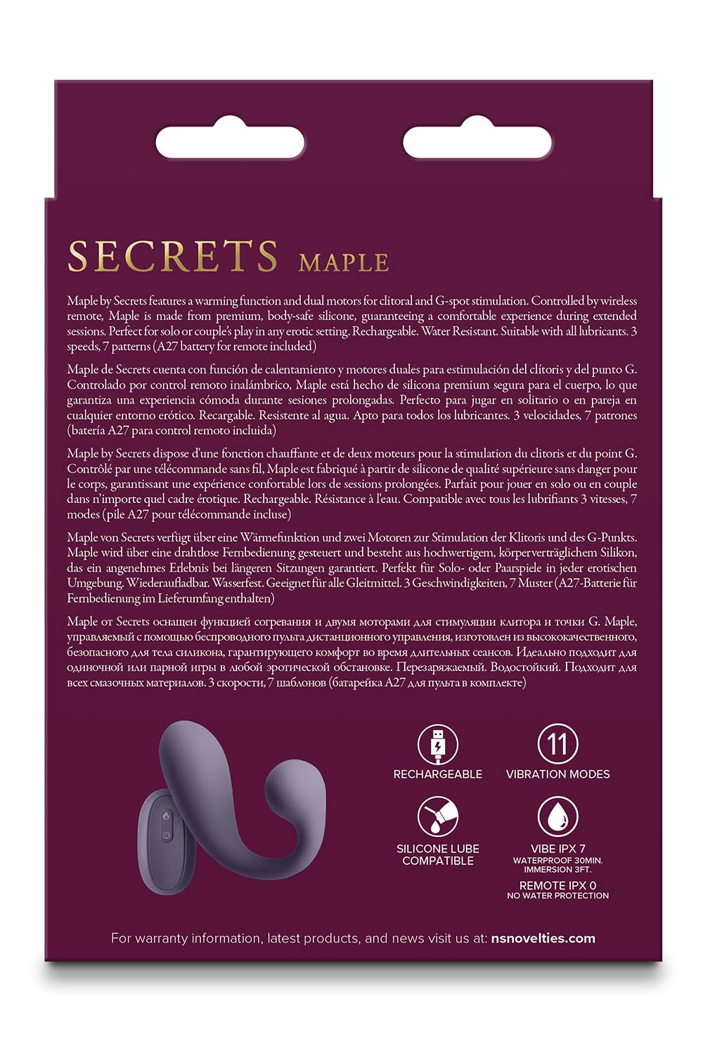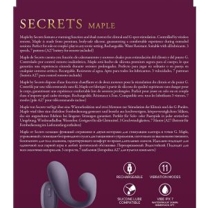 Maple by Secrets features a warming function and dual motors for clitoral and G-spot stimulation. Controlled by wireless remote, Maple is made from premium, body-safe silicone, guaranteeing a comfortable experience during extended sessions. Perfect for solo or couple’s play in any erotic setting. Rechargeable. Water Resistant. Suitable with all lubricants. Indulge in pure luxury with Maple by Secrets, a sophisticated vibrator featuring a warming function and dual motors designed for simultaneous clitoral and G-spot stimulation. Controlled by a wireless remote, Maple is crafted from premium, body-safe silicone for a comfortable experience during extended sessions. Ideal for solo play or enhancing couple’s intimacy, this versatile vibe offers 3 speeds and 7 patterns. Rechargeable and water-resistant, Maple is compatible with all lubricants, ensuring a delightful and safe exploration of pleasure. (A27 battery for remote included.)Warming function and dual motorsClitoral and G-spot stimulationWireless remote control3 speeds and 7 patternsRechargeable and water-resistantFor solo or couple’s playDimensions: 6.85 x 1.34 x 1.34 inch / 17,4 x 3,4 x 3,4 cmInsertable Dimensions: 5.51 x 1.34 inch / 14 x 3,4 cmMaterial: SiliconeA27 battery for remote includedWater resistantSuitable with all lubricantsCharger type: USB-PinCharge time: 80 minutesRun time: 70 minutes