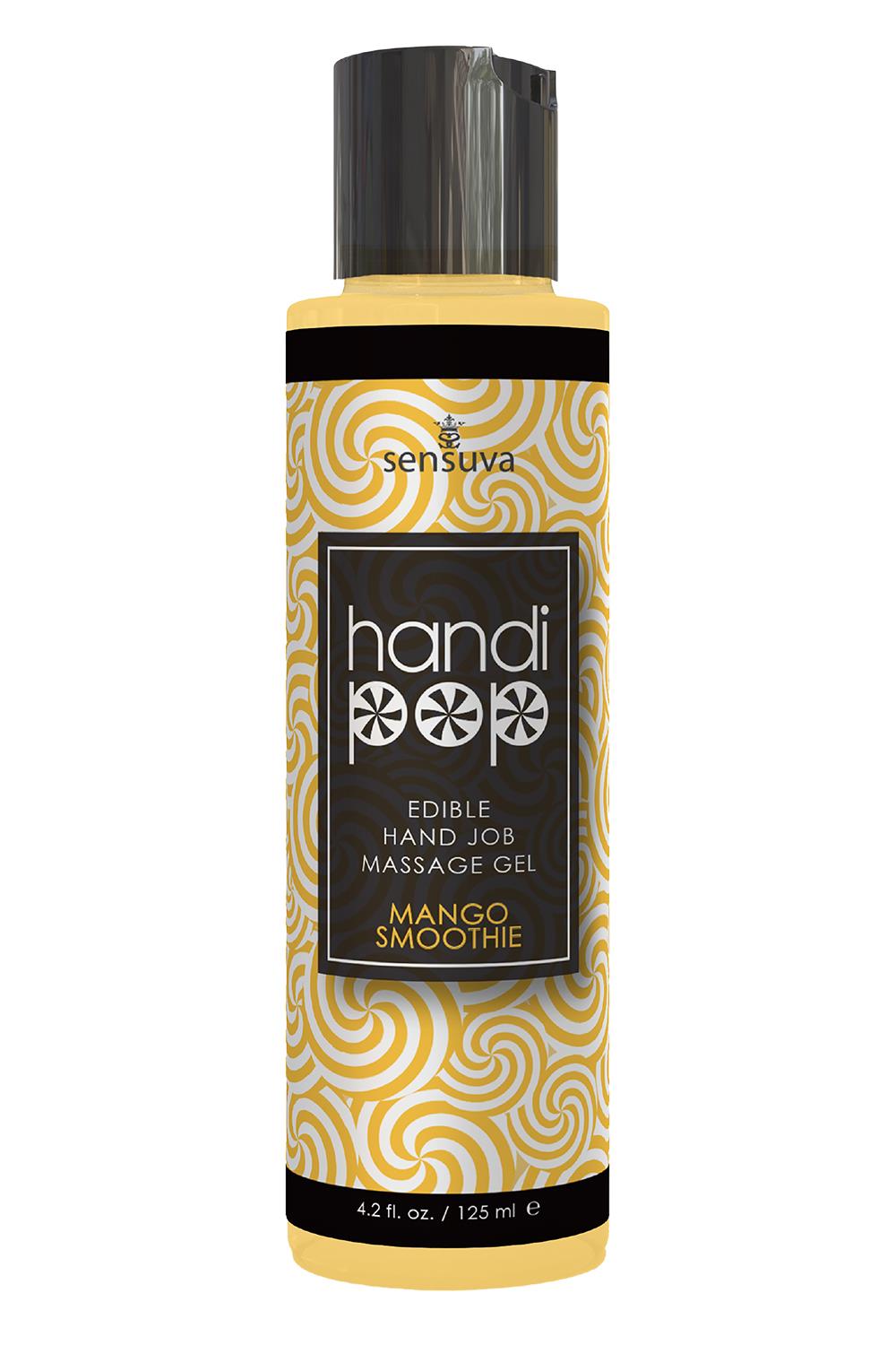 Let your hands work their magic to give him a hand massage he will never forget. HandiPop was created to give him an ultra slippery extra long handjob and at the end of the massage you can turn him into your favorite lollipop because this playful potion tastes absolutely amazing. It will be a pleasure for both of you.Ingredients:Water, Dimethicone, Melaleuca Alternifolia (Tea Tree) Leaf Oil, Propanediol, Cellulose, Ptychopetalum olacoides (Muira Puama), Epimedium (Horny Goat Weed), Polyacrylate, Polyisobutene, Polysorbate, Gluconolactone, Sodium Benzoate, Potassium Sorbate, Sucralose, Natural & Artificial Flavors, (May contain +/-) CI 42090 (Blue 1), CI 15985 (Yellow 6), CI 26100 (Red 17) Cruelty FreeParaben FreeGluten FreeVeganGlycerin Free