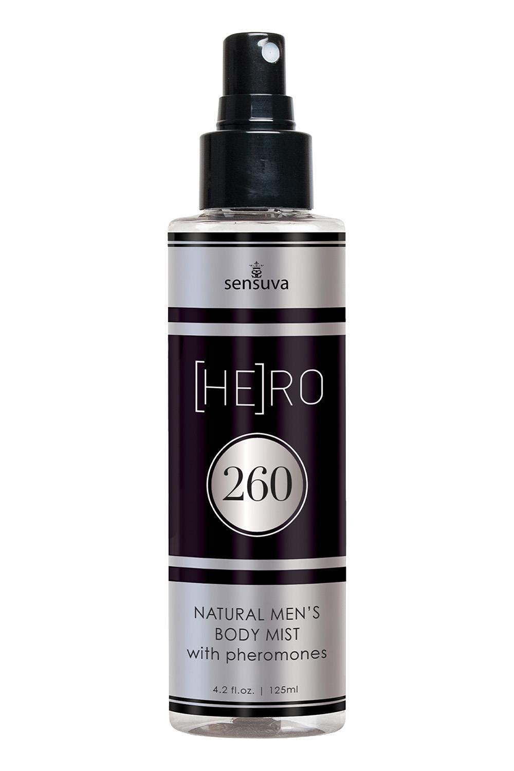 HE(RO) 260 Pheromone Infused Body Mist for Him 125 ml bottle.Created to boost his sexual confidence, and make him completely irresistible to you… your hero will top off his grooming routine with our pheromone-infused signature scented body mist that he can wear all day. Lightly spray on skin.Ingredients: Water, Hamamelis Virginiana (Witch Hazel) Extract, SD Alcohol 40b, Lepidium Mayenii (Maca), Paullinia Cupana (Guarana), Melaleuca Alternifolia (Tea Tree) Leaf Oil, Natural Tocopherol (Vitamin E), Glycerin (Vegetable), Essential Oil Blend, Propylene Glycol, Polysorbate, Gluconolactone, Sodium Benzoate, Potassium Sorbate, Fragrance, Pheromones (May contain +/-) (Blue 1), CI 15985 (Yellow 6), CI 26100 (Red 17)