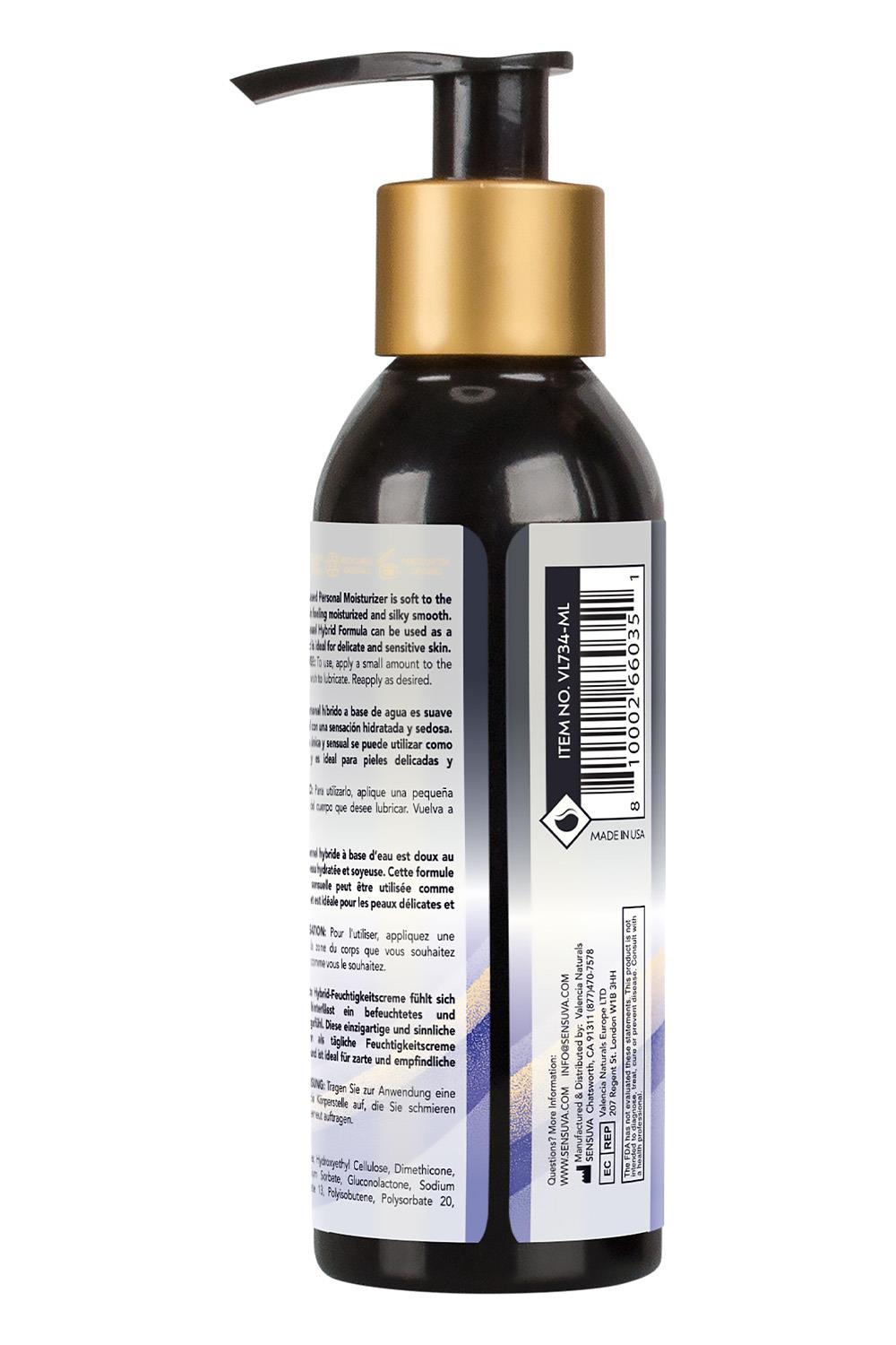 Sensuva’s Hybrid Water-Based Personal Moisturizer is the healthiest hybrid formula. It is an exceptional water-based formula blended with a small amount of medical-grade silicone to provide a longer-lasting, sensual glide. It is thinner than silicone so you can feel the curves of your partner and does not become sticky or tacky like typical water-based personal moisturizers. Shake well before use.Ingredients:Water, Hydroxyethyl Cellulose, Dimethicone, Propanediol, Potassium Sorbate, Gluconolactone, Sodium Benzoate, Polyacrylate 13, Polyisobutene, Polysorbate 20, Sodium Citrate, Sucralose, Artificial Flavor Glycerin FreeParaben FreeGluten FreeNon-sticky formulaWater-based glide with a small amount of medical-grade silicone