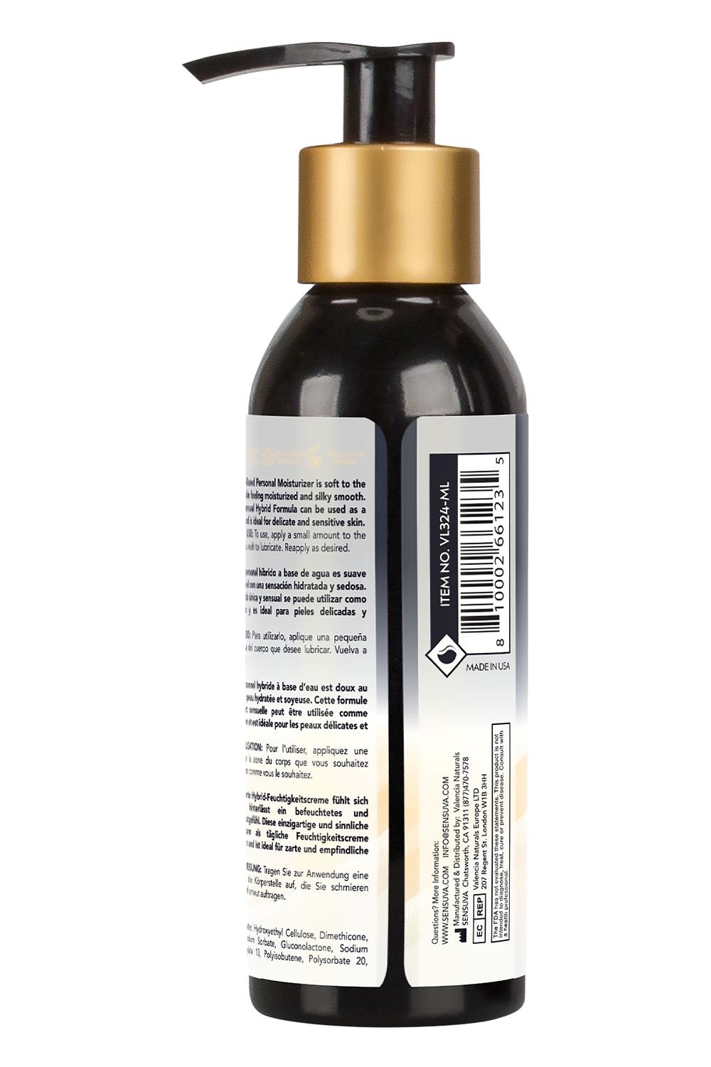 Sensuva’s Hybrid Water-Based Personal Moisturizer is the healthiest hybrid formula. It is an exceptional water-based formula blended with a small amount of medical-grade silicone to provide a longer-lasting, sensual glide. It is thinner than silicone so you can feel the curves of your partner and does not become sticky or tacky like typical water-based personal moisturizers. Shake well before use.Ingredients:Water, Hydroxyethyl Cellulose, Dimethicone, Propanediol, Potassium Sorbate, Gluconolactone, Sodium Benzoate, Polyacrylate 13, Polyisobutene, Polysorbate 20, Sodium Citrate Glycerin FreeParaben FreeGluten FreeNon-sticky formulaWater-based glide with a small amount of medical-grade silicone