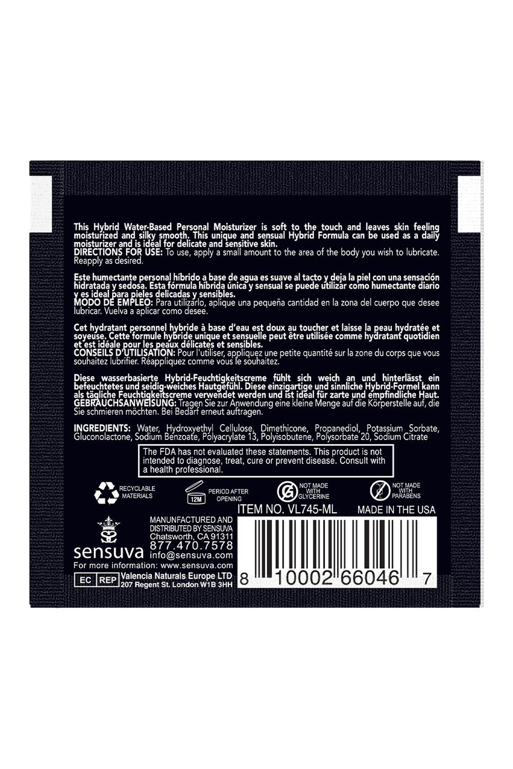 Sensuva’s Hybrid Water-Based Personal Moisturizer is the healthiest hybrid formula. It is an exceptional water-based formula blended with a small amount of medical-grade silicone to provide a longer-lasting, sensual glide. It is thinner than silicone so you can feel the curves of your partner and does not become sticky or tacky like typical water-based personal moisturizers. Shake well before use.Ingredients:Water, Hydroxyethyl Cellulose, Dimethicone, Propanediol, Potassium Sorbate, Gluconolactone, Sodium Benzoate, Polyacrylate 13, Polyisobutene, Polysorbate 20, Sodium Citrate, Sucralose, Artificial Flavor Glycerin FreeParaben FreeGluten FreeNon-sticky formulaWater-based glide with a small amount of medical-grade silicone