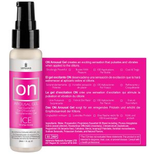 ON Ice Arousal Gel provides the same vibrating sensation you feel with ON Arousal Oil, just in an easy-to-use, mess-free, water-base safe formula! Containing the same unique, natural ingredients found in ON Arousal Oils, ON Arousal Gel creates an exciting cooling sensation that pulsates and vibrates when applied to the clitoris. ON Arousal Gel even makes most women feels as though they are lubricating MORE!Ingredients:Water, Propanediol, Prunus Amygdalus Dulcis, Mentha Piperita Oil, Menthol, Rosmarinus Officinalis, Cinnamomum Zeylanicum, Mixed Tocopherols, Cellulose, Polyacrylate-13, Polyisobutene, Polysorbate 20, Cetearyl Alcohol, Polysorbate 60, Hydroxyethyl Cellulose, Sodium Benzoate, Gluconolactone, Zanthoxylum Americanum, Potassium Sorbate, Sucralose, and Natural FlavorsVeganCruelty FreeParaben FreeGluten FreeGlycerin FreeWater-base safe in a thicker gel formulaPulsates and vibratesShockingly powerfulNo-mess gel100 applications per bottle