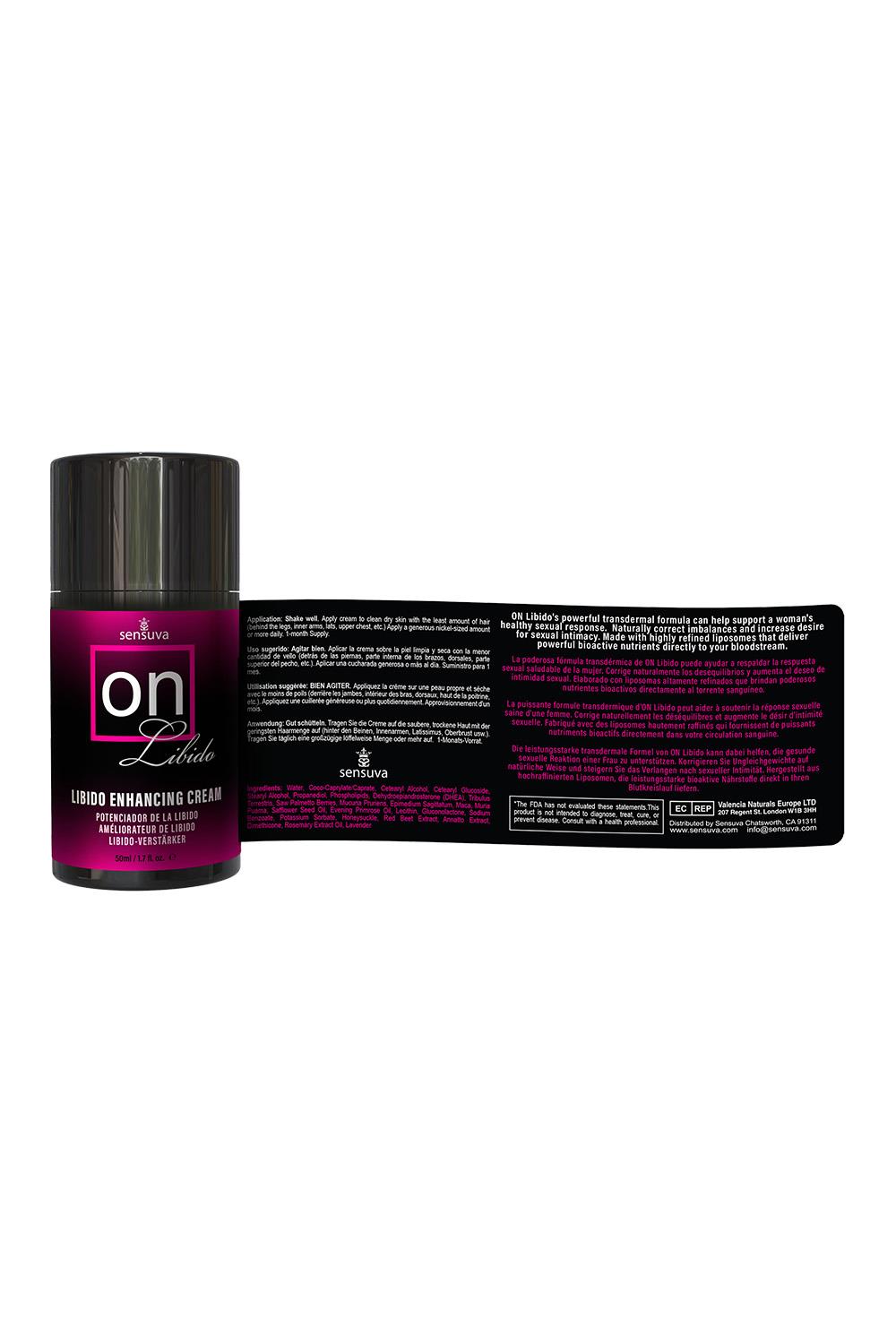 On™ Libido is a Daily Cream that Enhances and Naturally Boosts one’s Libido.What is the exciting thing about On Libido?The exciting thing about ON Libido is that FINALLY there is a product that stimulates a woman’s internal want and desire for sex. Typical arousal products create a physical reaction, but they do not necessarily make a woman think about sex and want it, like ON Libido.ON Libido is formulated to support a woman’s healthy sexual response and desire. It naturally corrects imbalances that may be robbing a woman of her desire for sexual intimacy. In other words, it helps women get their mojo back!Unlike pills that lose their potency almost immediately, ON Libido uses transdermal technology to deliver the active ingredients directly into the bloodstream.Why is On Libido important for a woman?Feeling turned on and wanting sex is part of a woman’s natural state of well-being. When she feels turned on and her internal sexual desire is present, she feels sexy, alive and passionate about ALL aspects of her life. To a woman losing that desire is like losing a part of herself.How can On Libido help couples?On Libido can help couples feel more connected. Couples often fear that if one or both of them lose their desire for sexual activity, there is something wrong with their relationship emotionally. That would be a terrible mistake if the cause was actually something physiological that could be easily fixed. Using ON Libido helps women naturally correct internal imbalances and regain their sexual desire.Increases sexual desire and arousal naturallyIncreases blood flow to the vaginal areaMakes her more sensitive to stimulationHelps balance her hormonesHelps boost energy and elevate moodMade with natural ingredientsThe airless pump is hygienic & preserves the formula’s potencyIt is not a personal lubricantGlycerin and Paraben-freeNo artificial dyes, perfumes, or harsh preservativesThis bottle is a 1 month supply with daily usage.