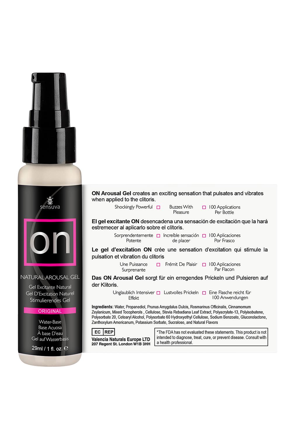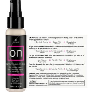 ON Arousal Gel increases a clitoral orgasm intensity, duration and frequency, now in a no-mess water-base safe formula! Designed to enhance intimacy, ON Gel uses a natural botanical blend of essential oils to create feelings of natural arousal and increased lubrication in most vulva users.