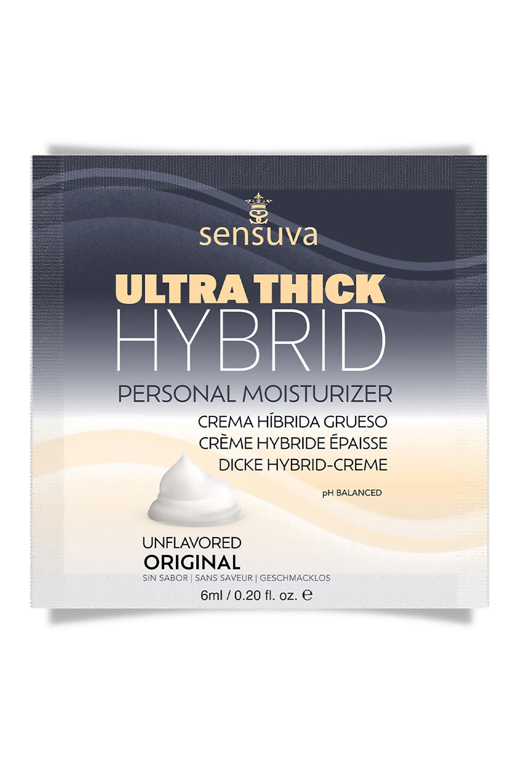 SENSUVA’S Ultra-Thick Hybrid Personal Moisturizer is soft to the touch and leaves skin feeling moisturized and silky smooth. The unique and sensual consistency of the Hybrid Formula may help partners feel each other’s body and connect more. It can be used as a daily moisturizer and is ideal for delicate and sensitive skin.Ideal for anyone who prefers the idea of using something gentle & soothing for delicate tissue, women going through menopause, or anyone who typically has allergies or sensitivities. Shake well before use.Ingredients:Water, Hydroxyethyl Cellulose, Dimethicone, Propanediol, Potassium Sorbate, Gluconolactone, Sodium Benzoate, Cyclopentasiloxane, Dimethiconol, Polyacrylate 13, Polyisobutene, Polysorbate 20, Sodium Citrate, Cetyl Alcohol, Stearic Acid, Artificial Flavor Glycerin FreeParaben FreeGluten FreeSafe to use with latex and silicone productsUltra comfortable and long-lasting glide