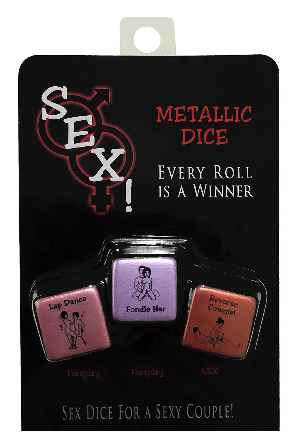 In English, Español, Francais, and Deutsch. Sex dice for a sexy couple! Three vibrant, metallic-colored dice for foreplay and sex play. Take turns rolling the dice. Act out each foreplay action on the first two dice. If a wild is rolled either he or she gets to decide what foreplay action depending on which wild is rolled. If both wilds are rolled, you win! When you win you also get to act out the third “SEX” die after the foreplay dice. The roller interprets how each die illustration is acted out.Kheper Games, Inc. is excited to announce Metallic Sex! Dice as a new game joining their extensive line of award winning adult games. The game utilizes new technology that allows the dice to be metallic without having to be made of metal. Metallic Sex! Is a dice game with three bright metallic dice. Two players take turns rolling all three dice and carrying out foreplay actions on the pink and purple dice on each other. When a Wild! is rolled, the player decides on the action or body part, and when both Wild!s are rolled, that player wins and gets to decide how the position on the red die is carried out.