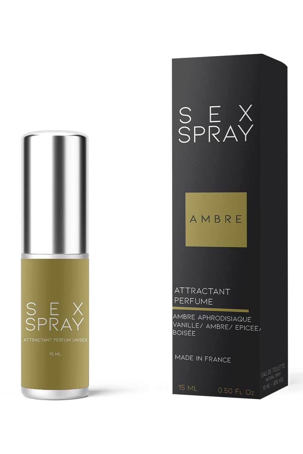 Sex Spray is a perfume with strong effect for men. Amber acts like pheromones, an animal substance that directly stimulates the sense of smell without physical contact. Sex Spray is a seductive eau de toilette composed of aphrodisiacs scents such as amber, vanilla or wood. Presented in a handy pocket spray, Sex Spray is discreet and easy to carry so you can use it wherever you need.Fragrances: Vanilla, amber, spice, woodyEau de Toilette for men15 mlTop notes: Bergamot / lemon / black pepperHeart notes: Lavandin / cedar / ginger / basilBase notes: Patchouli / amber / vanilla / muskRecommend use: Spray a little sex spray at strategic places such as behind the ears, on the