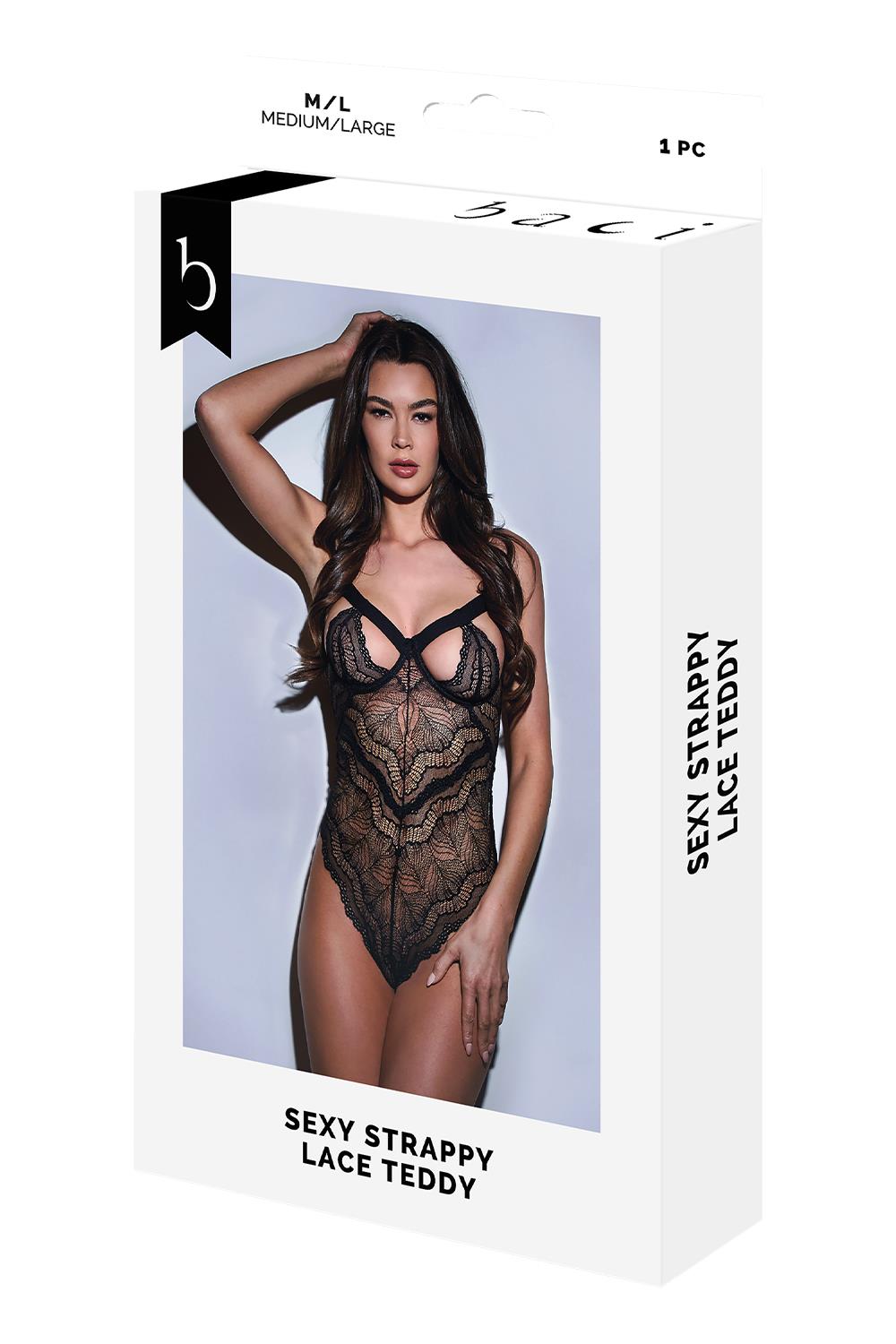 Lacy, strappy and peekaboo detailing – all things to love with Baci’s newest teddy! Available in midnight black or cerulean blue, traditional this teddy isn’t! Designed in a stunning and intricate lace, this sheer look is sure to become a favorite! Cut high at the hips with a cheeky back, open cups pair with delicate lace detailing to show off your favorite assets while keeping just a bit of the mystery alive!