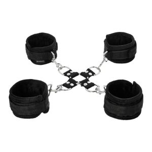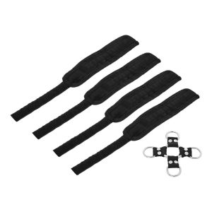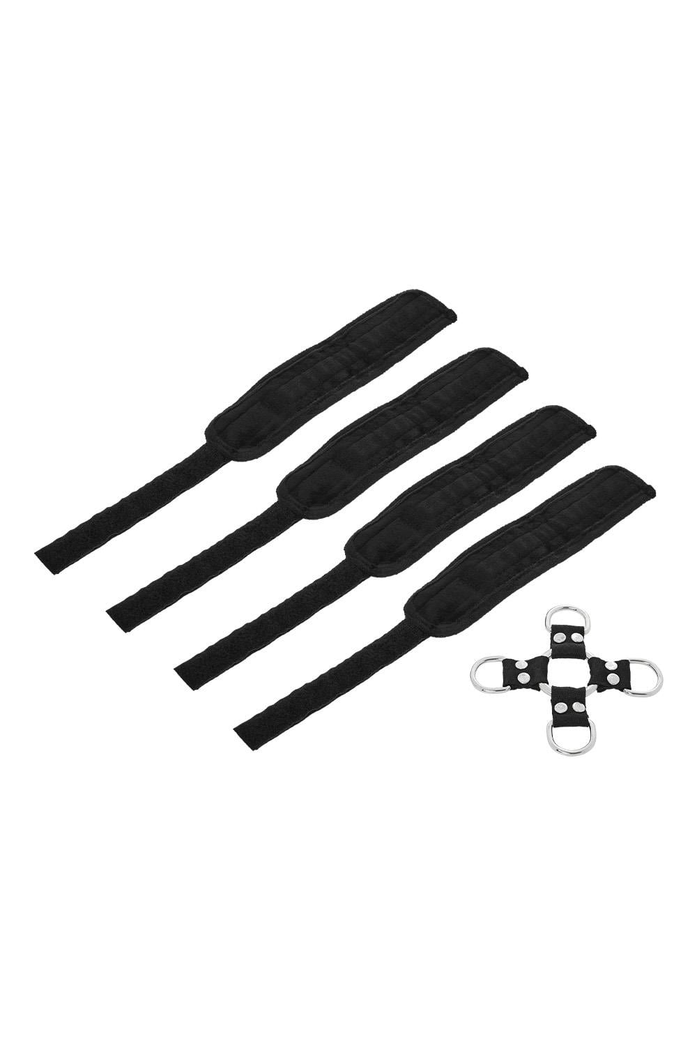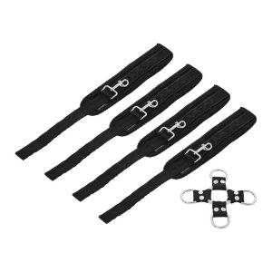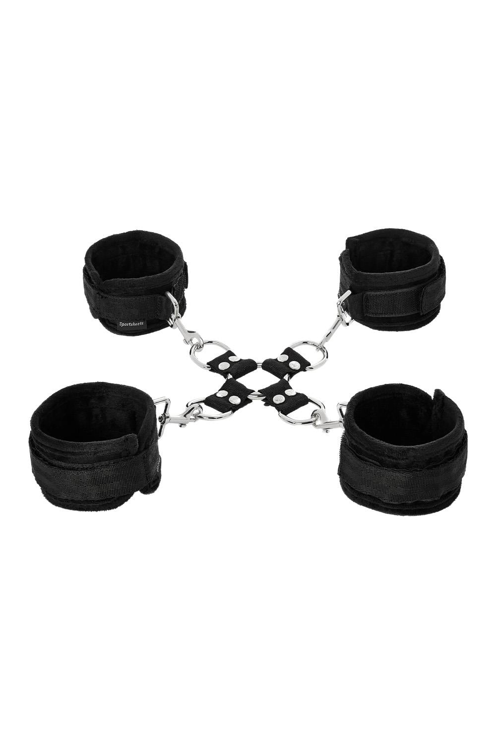 Four durable yet comfortable Sportsheets cuffs allow for a myriad of positions only limited by your dirty mind. Perfect for beginners or experienced bondage enthusiasts, this leather-free set includes the hogtie center connector and 4 detachable cuffs. Made with heavy-duty hardware, each hook clasps easily onto the D-rings of the hogtie. Alternately, the adjustable hook and loop cuffs can be used on their own as handcuffs and ankle cuffs. The 5 Piece Hog Tie and Cuff Set can be used in the front or behind the back depending on what you have in mind for the evening. Sturdy yet quick to remove, this product creates quick and easy ways to restrain your partner.Materials: 35% Nickel-Free Metal Hardware, 30% Polyester, 27% Polypropylene Webbing, 8% Hook and Loop