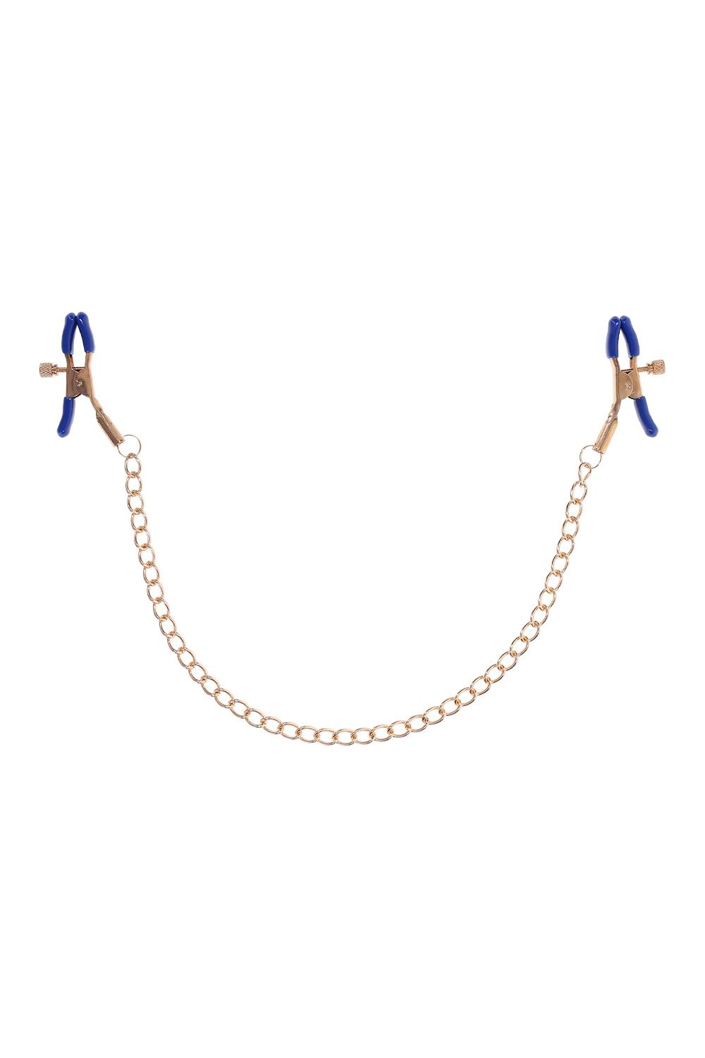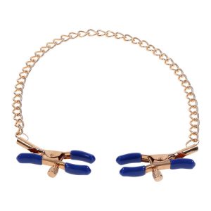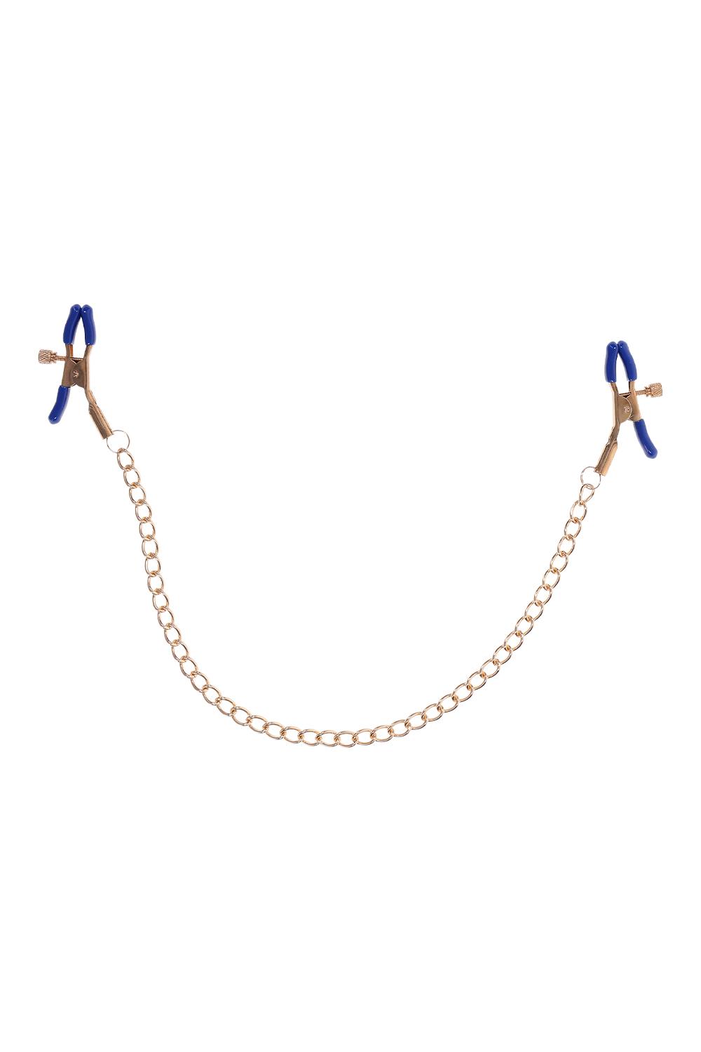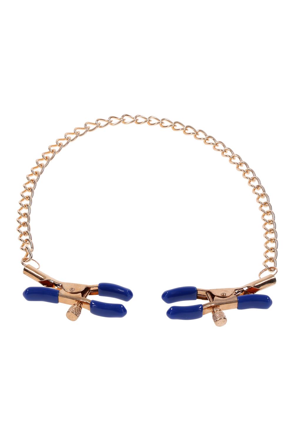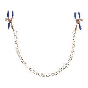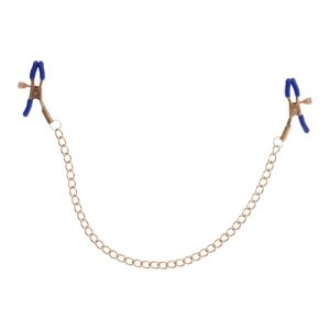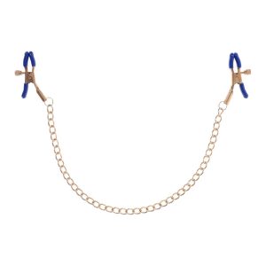 These exquisite clamps feature a gold chain and striking blue plastic tips, blending elegance with a touch of wild playfulness. Perfect for those new to BDSM or seasoned enthusiasts, the adjustable thumb-screws allow you to control the pressure, ensuring a tailored experience. The shimmering gold chain not only adds a sophisticated touch but also offers a tempting opportunity for gentle tugs as passion intensifies. Let your imagination run wild and explore the tantalizing sensations these versatile clamps can bring to various parts of your body. Perfect for nipple stimulation and may be used in other sensitive areasRemovable rubber tips for varied intensityChain 13” / 33 cmMaterials: 92% iron, 8% phthalate free PVC