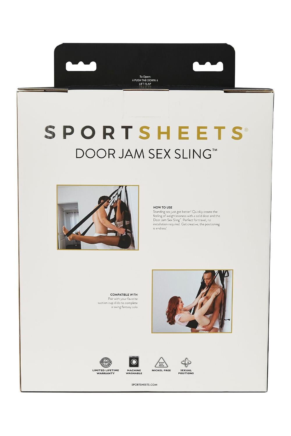 Strong, durable, and highly adjustable for your most creative sexual endeavors! With the Door Jam Sex Sling, Sportsheets has designed a solution that empowers couples to experiment with exciting new positions without worries about stamina, awkwardness, or injuries. Just secure the sling over your door by closing it on the dowels and adjust each of the straps to the perfect lengths for your bodies and chosen position. The footrests, hand straps, and a padded seat ensure comfort during your most vigorous carnal explorations. When you’re both satisfied, this sling is easy to take down and store away for next time!Features:Easy to set up and take downAdjustable for infinite positionsSupports up to 350 pounds (158 kg)Machine washable