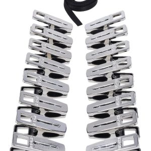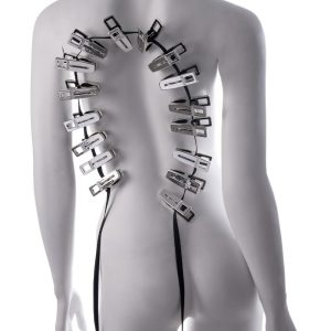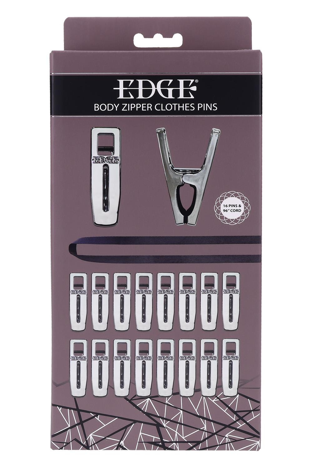 Submit to sensation. Suffer in sequence. The Edge® Body Zipper Clothes Pins turn control into artful cruelty. Sixteen silver-plated clamps await your command, ready to fasten to flesh and link through a heavy-duty 96-inch flat cord. Thread the cord through each clamp, then pull to zip, each motion tugging at the body in a slow, merciless wave of pressure that blurs the line between pain and pleasure. Silicone-lined interiors ensure a secure bite that holds until release. Finished in polished silver-plating with the Edge logo engraved on both sides, this set delivers portable, precision-built domination. Travel-friendly and ready for any scene.