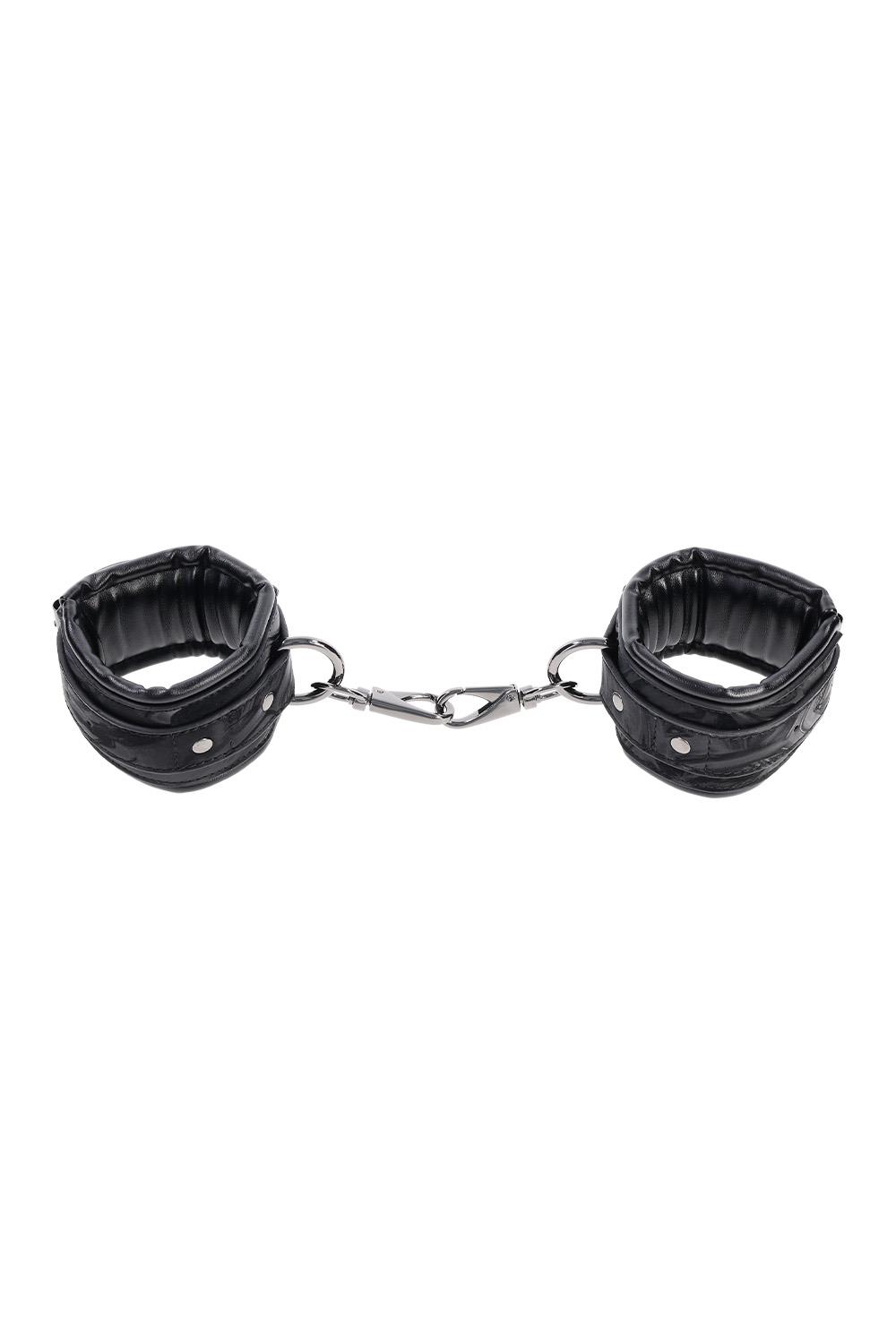 Slip on seduction and keep control firmly in hand. The Velvet Noir Handcuffs are crafted from smooth faux leather with a velvet-like feel, wrapping your partner in soft restraint that’s as indulgent as it is secure. The hematite hardware adds a sleek, moody edge, locking wrists in place while leaving room for playful resistance. Adjustable for every fit and fantasy, these cuffs are built to entice, whether for fleeting moments or a night-long scene. With elegance meeting control, the tighter the grip, the sweeter the surrender.Adjustable cuffs fit wrists up to 9.5inch / 24cm with a secure and comfortable fitBuckle closures keep wrists securely restrained for uninterrupted playSuitable for both beginners and experienced users seeking stylish restraintMaterials: 80% PU, 15% Iron Alloy, 5% Zinc Alloy