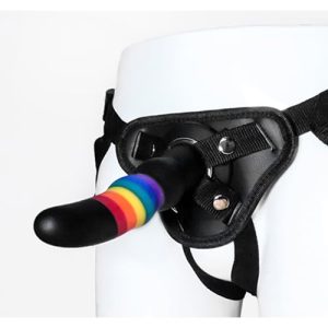 Ten kolorowy wibrator Love jest wykonany z miękkiego w dotyku silikonu i nie zawiera ftalanów, w jasnych kolorach tęczy Pride w połączeniu z czernią. Szeroka podstawa jest idealna do utrzymania wibratora na miejscu w dołączonej uprzęży z paskiem. Można go łatwo przymocować do uprzęży za pomocą zatrzasków i metalowego pierścienia. Szelki można dopasować do wielkości ciała.