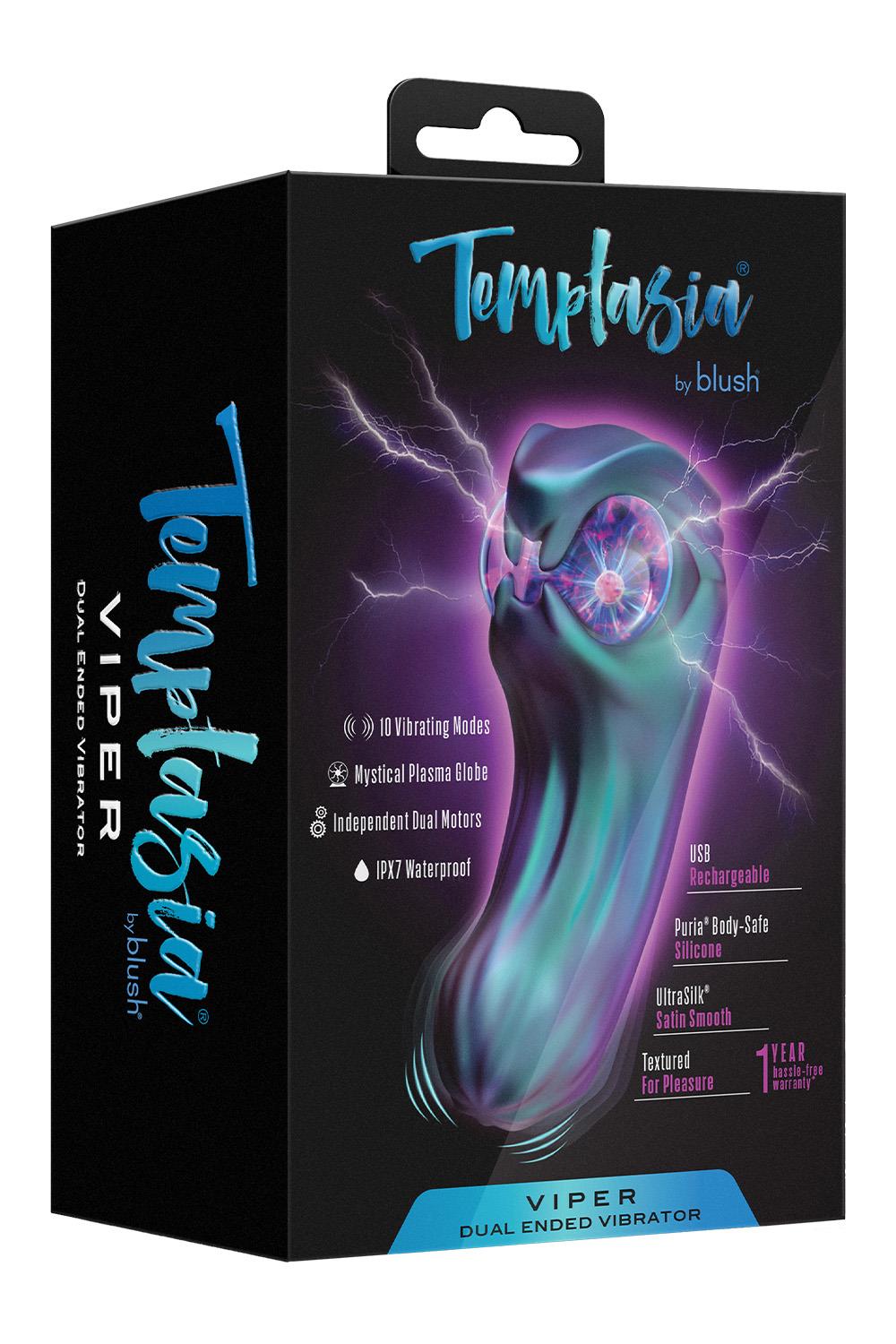 Temptasia’s Viper lures you into a spellbinding embrace with its mystical plasma globe, pulsing like lightning beneath your touch, glowing brighter as your arousal builds. Featuring 10 dual vibration modes (3 speeds & 7 patterns), Viper enhances every touch, awakening both internal and external pleasure. Its dual-ended design doubles the temptation, with each side uniquely sculpted to tease, grip, and awaken your deepest desires. Every curve and ridge is heightens sensation, while Blush’s UltraSilk® satin-smooth silicone glides luxuriously across your skin for an indulgent touch. Viper is waterproof and USB rechargeable, so it’s always ready when your desires awaken. Its radiant glow and sleek, daring design ignite passion the moment you touch it. Bold and irresistibly seductive, it captivates, excites, and drives you deeper into waves of electrifying pleasure.Mystical Plasma Globe Creates a Spellbinding Display10 Dual Vibration Modes (3 Speeds & 7 Patterns)Sculpted Textures For Precision StimulationUltraSilk® Satin Smooth, Body-Safe SiliconeWaterproof & USB Rechargeable For Endless PlayLength 5.5 inch / 13,9 cmWidth 1.5 inch / 3,8 cmInsertable length 3 inch / 7,6 cmManual: Video Manual