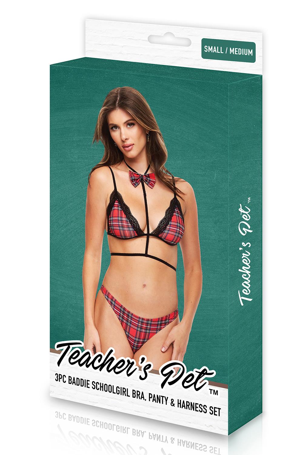 Niezależnie od tego, czy chcesz oświetlić scenę, czy zabrać sztukę do buduaru, Zwierzak nauczyciela zapewni Ci wszystko! Ten trzyczęściowy zestaw z pewnością NIE nadaje się do klasy! Nisko wycięte stringi w szkocką kratę doskonale komponują się z koronkowym stanikiem i fantazyjnym chokerem z muszką (z dodatkowymi paseczkami biegnącymi przez klatkę piersiową i talię!).