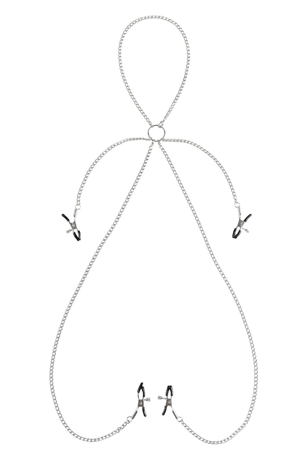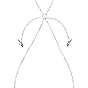 Designed to cater to your preferences, these clamps are adorned with a chain that is attached to a set of clit clamps. The clamps get tighter by twisting the screw on the pinchers. Enjoy these sexy pinches!